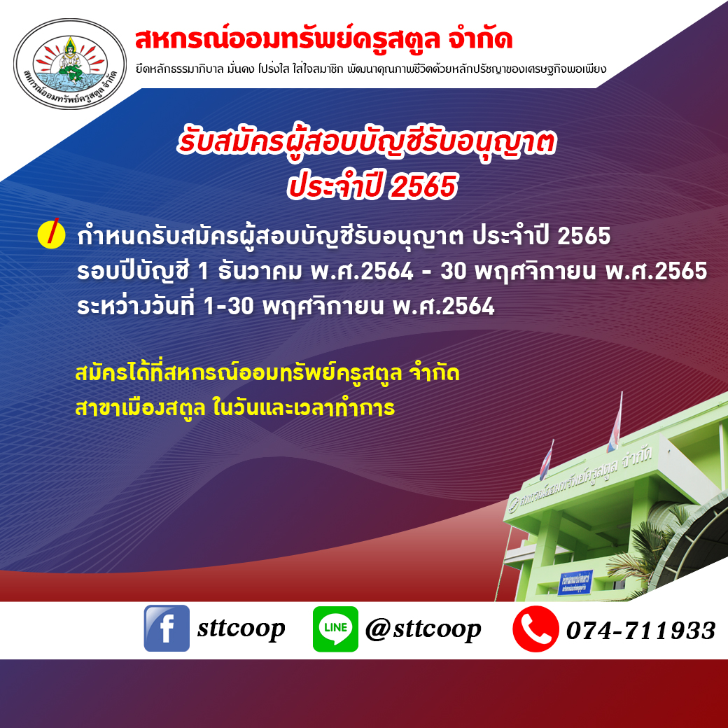 ด้วยสหกรณ์ออมทรัพย์ครูสตูล จำกัด จะประชุมใหญ่สามัญประจำปี 2564 ในวันเสาร์ ที่ 25 ธันวาคม พ.ศ.2564 และที่ประชุมใหญ่จะคัดเลือกผู้สอบบัญชีรับอนุญาตเพื่อเข้าตรวจสอบบัญชีของสหกรณ์ออมทรัพย์ครูสตูล จำกัด ในการนี้ทางสหกรณ์ฯ กำหนดรับสมัครผู้สอบบัญชีรับอนุญาต ประจำปี 2565 รอบปีบัญชี 1 ธันวาคม พ.ศ.2564 สิ้นสุด 30 พฤศจิกายน พ.ศ.2565 ระหว่างวันที่ 1-30 พฤศจิกายน พ.ศ.2564 โดยผู้สนใจส่งเรื่องสมัครได้ที่สหกรณ์ออมทรัพย์ครูสตูล จำกัด เลขที่ 458 หมู่ที่ 6 ถนนยนตรการกำธร ตำบลคลองขุด อำเภอเมืองสตูล จังหวัดสตูล โทรศัพท์ 074 – 711933 ในวันและเวลาทำการของสหกรณ์ออมทรัพย์ครูสตูล จำกัด หรือทาง E-mail : sttcoop2@gmail.com