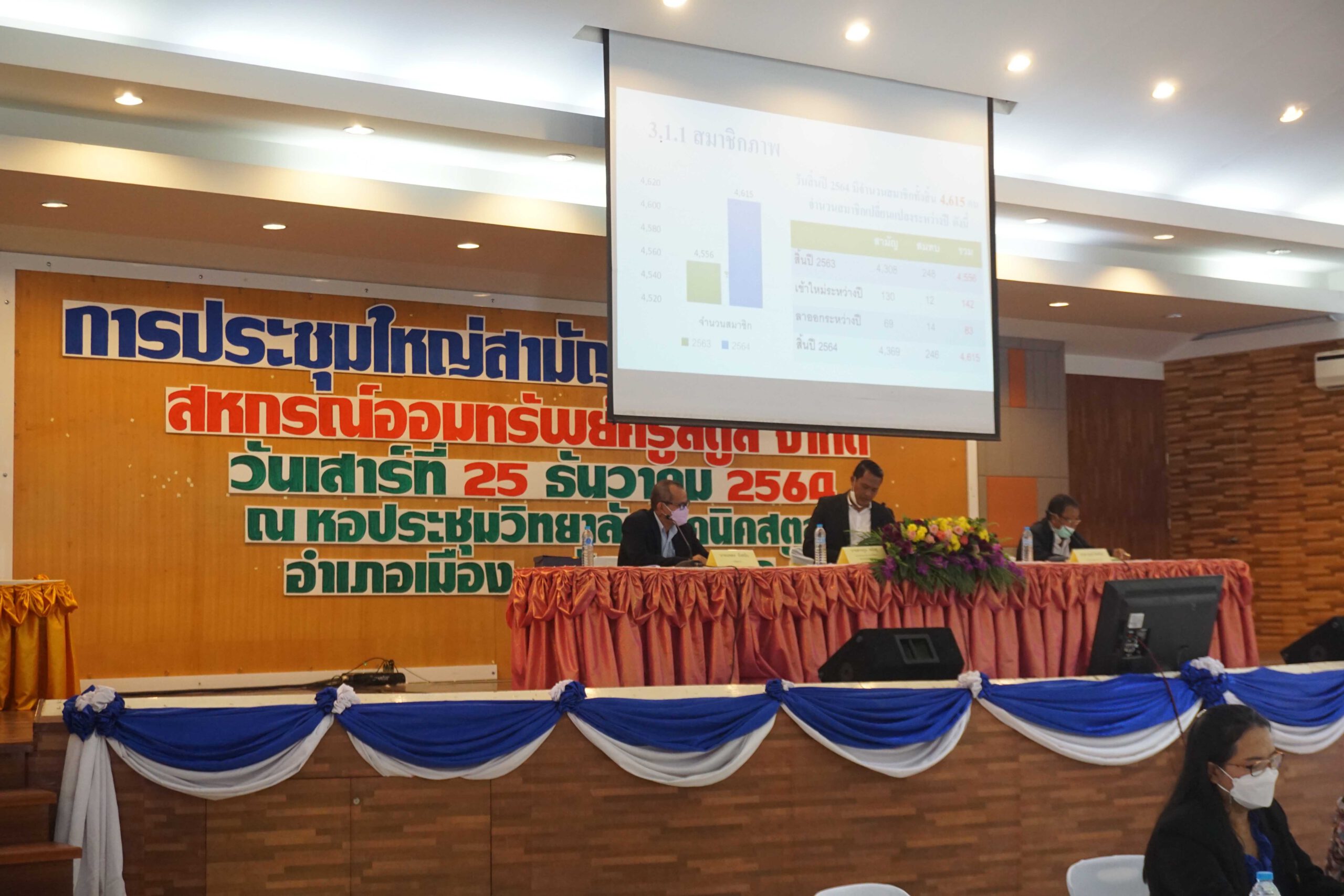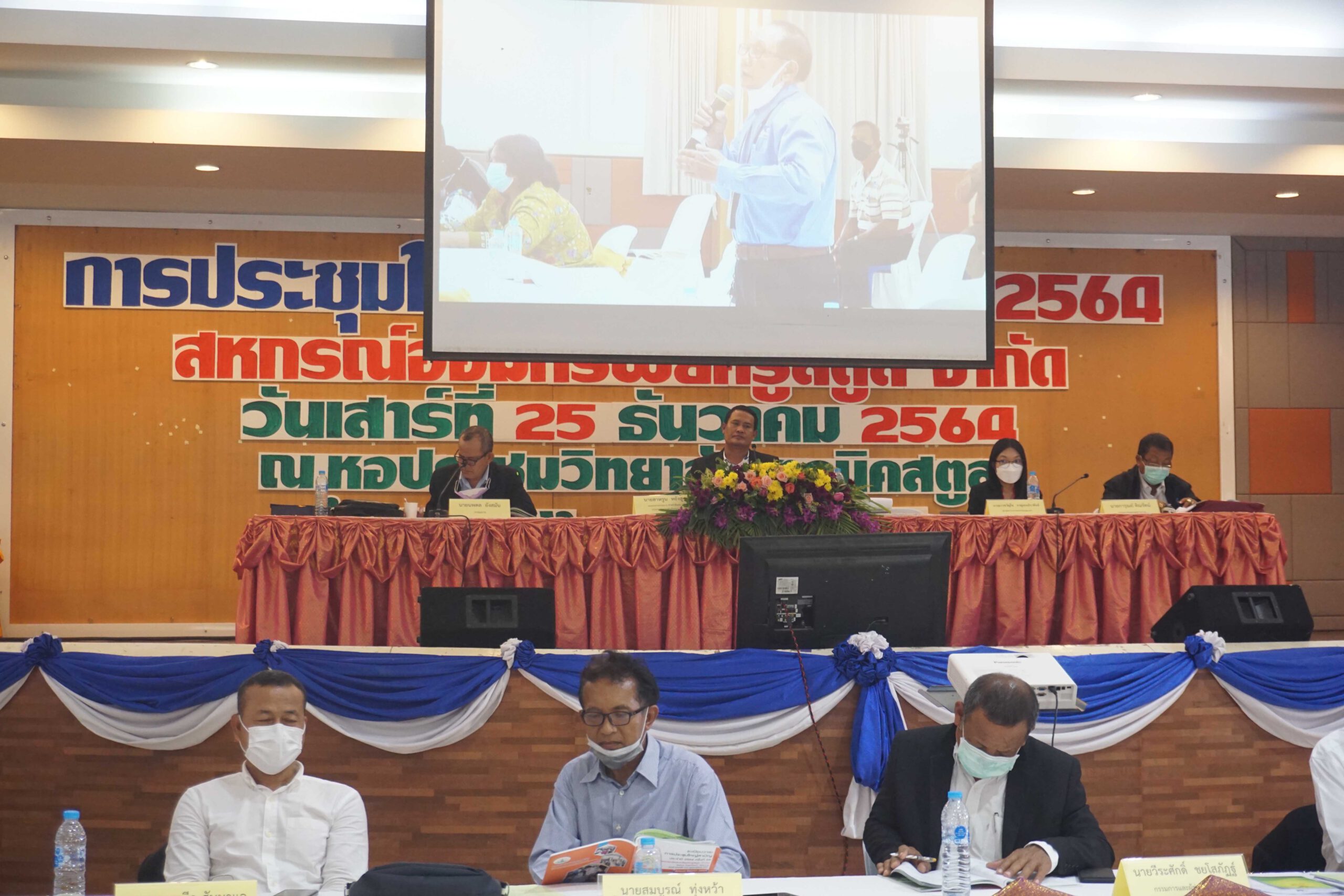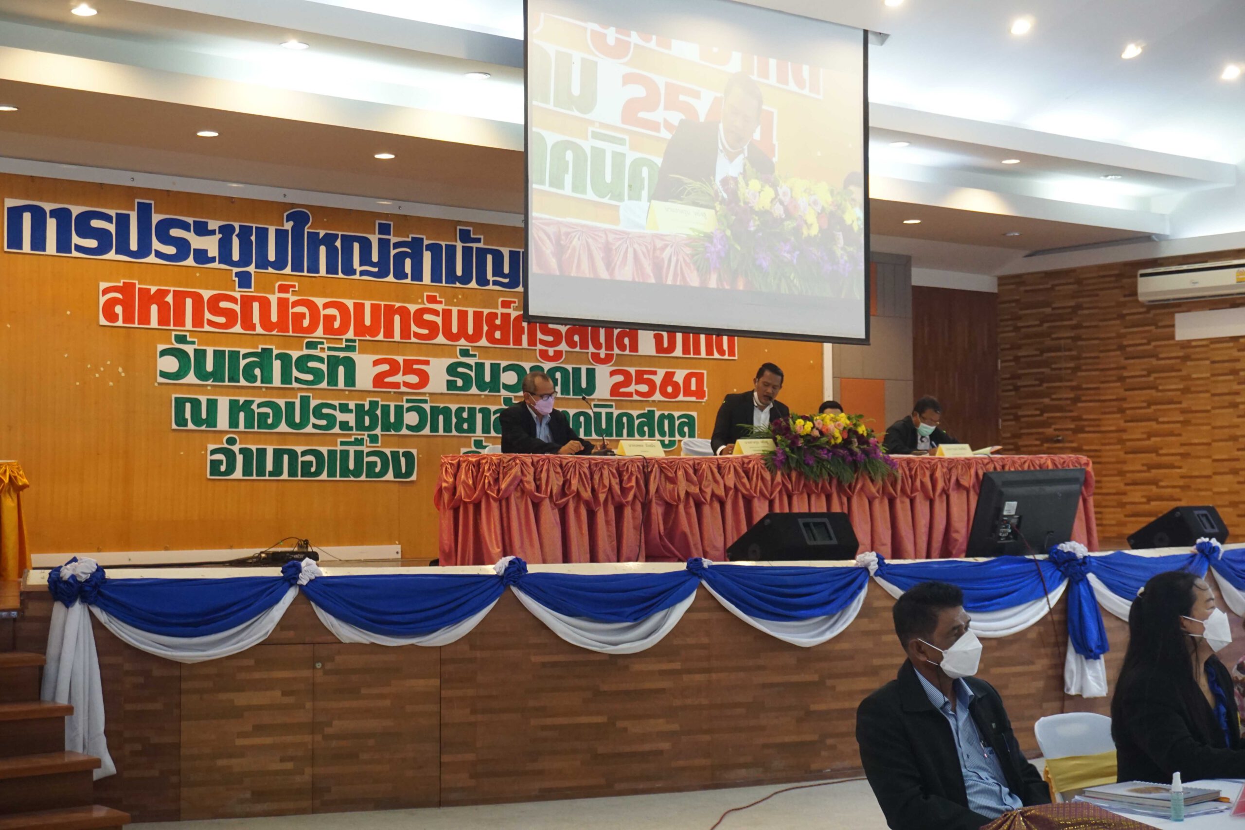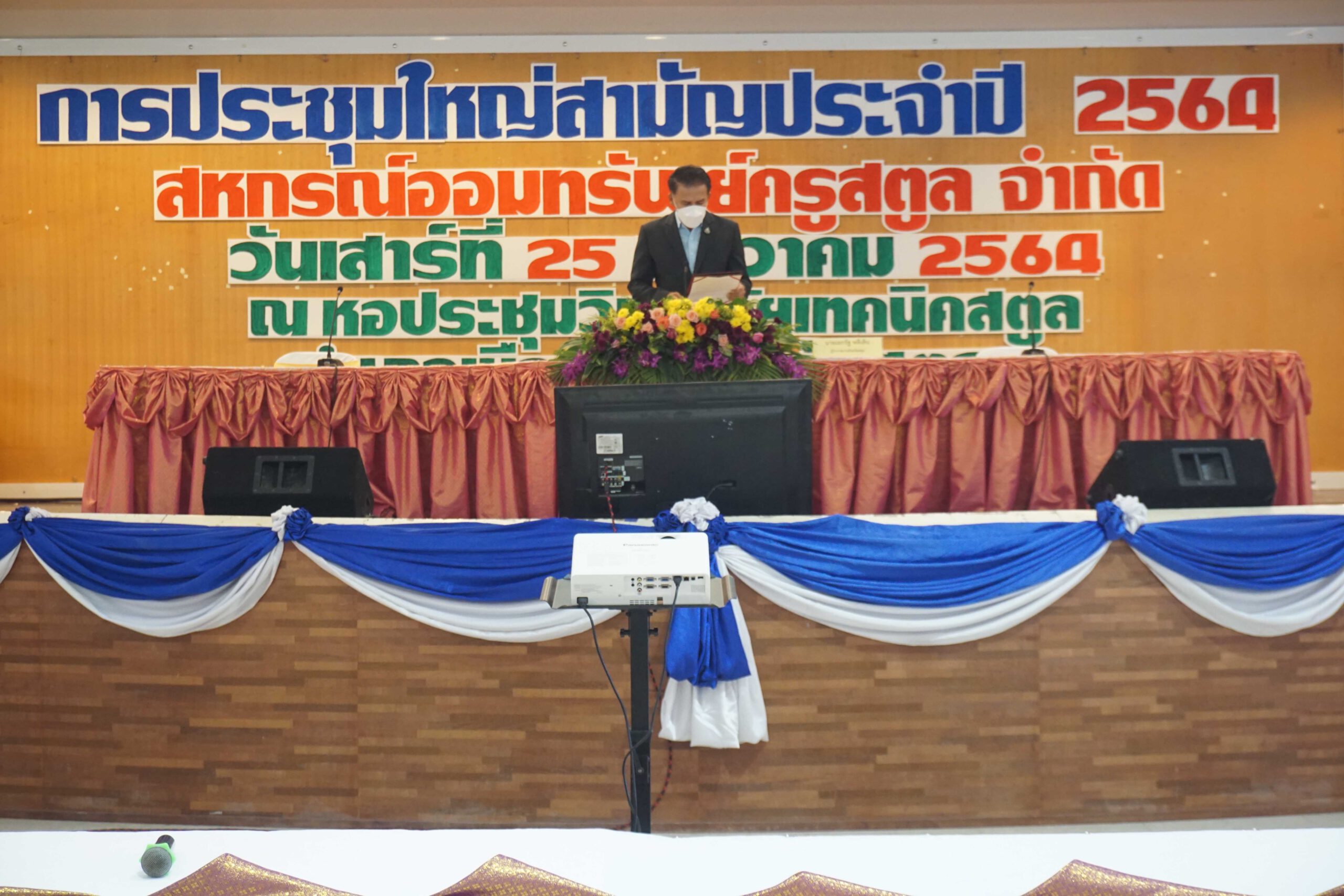 วันนี้ 25 ธันวาคม 2564 ณ หอประชุมวิทยาลัยเทคนิคสตูล อำเภอเมืองสตูล จังหวัดสตูล นายเอกรัฐ หลีเส็น ผู้ว่าราชการจังหวัดสตูล เป็นประธานในพิธีเปิดการประชุมใหญ่สามัญประจำปี 2564 ของสหกรณ์ออมทรัพย์ครูสตูล จำกัด โดยมี นายฮาหรูน หยังสู รองประธานกรรมการสหกรณ์ออมทรัพย์ครูสตูล จำกัด กล่าวรายงานวัตถุประสงค์ พร้อมด้วยสหกรณ์จังหวัดสตูล ผู้อำนวยการวิทยาลัยเทคนิคสตูล ผู้แทนสมาชิกสหกรณ์ออมทรัพย์ครูสตูล จำกัด เข้าร่วมประชุมกว่า 400 คน ภายใต้มาตรการป้องกันโรคโควิด-19 อย่างเคร่งครัด