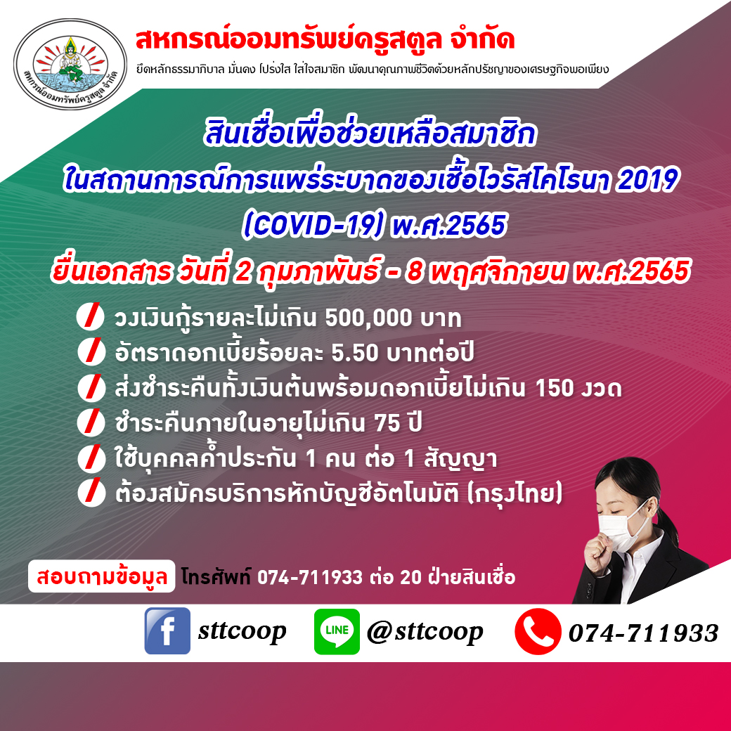 อาศัยมติที่ประชุมคณะกรรมการดำเนินการสหกรณ์ออมทรัพย์ครูสตูล จำกัด ชุดที่ 56 ในการประชุมครั้งที่ 2/2565 เมื่อวันที่ 25 มกราคม 2565 ได้กำหนดหลักเกณฑ์โครงการให้สินเชื่อเพื่อช่วยเหลือสมาชิกในสถานการณ์การแพร่ระบาดของเชื้อไวรัสโคโรนา 2019 (COVID-19) พ.ศ.2565