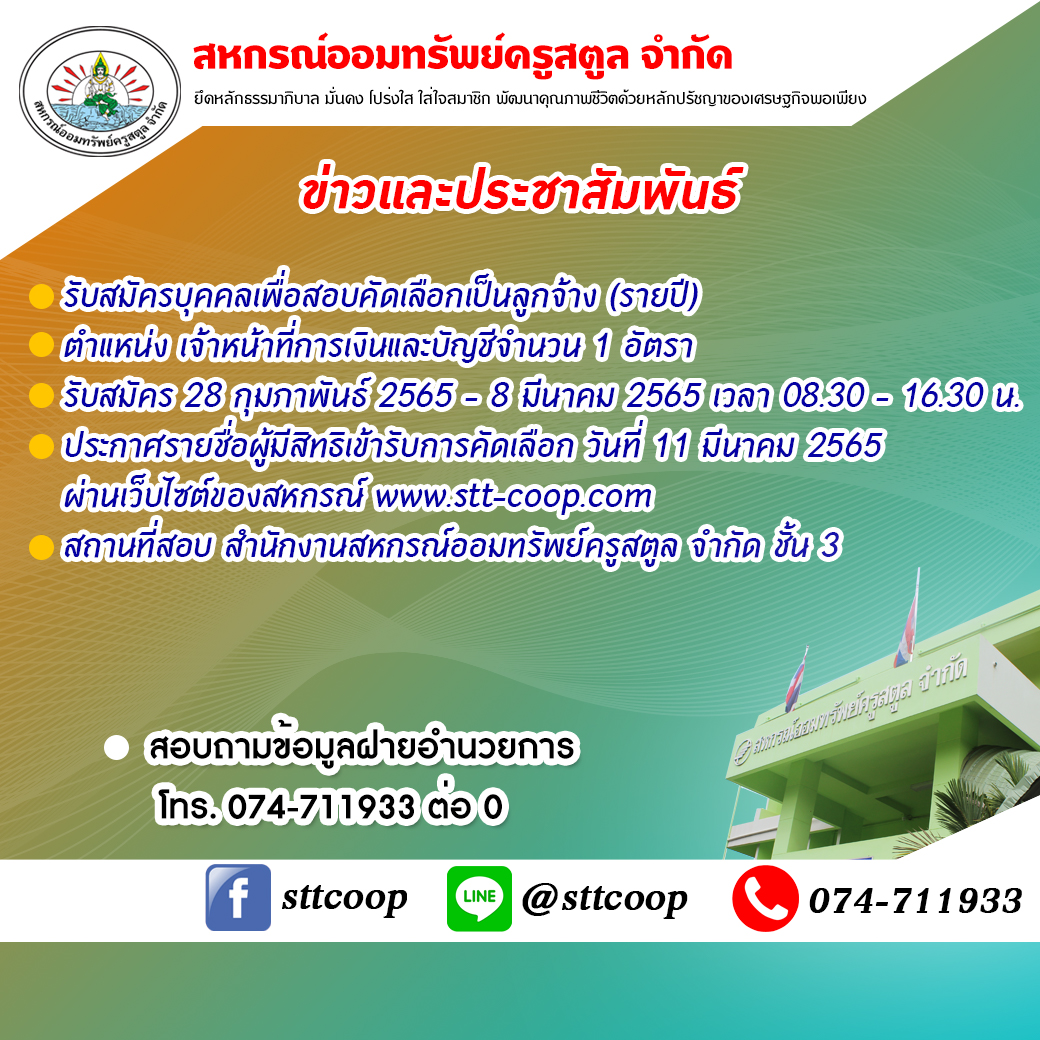 สถานที่สอบ สำนักงานสหกรณ์ออมทรัพย์ครูสตูล จำกัด ชั้น 3