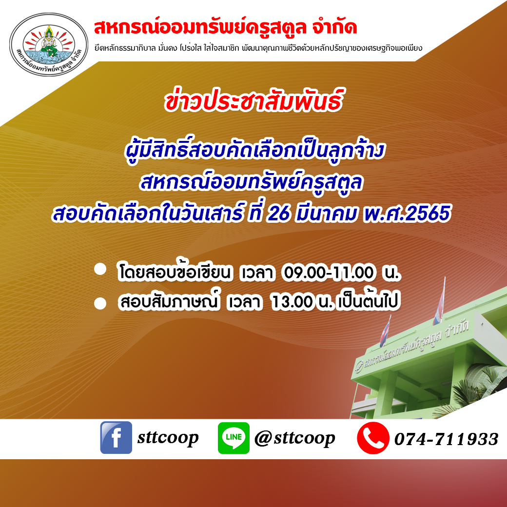อ่านรายละเอียดที่นี่ >>ผู้มีสิทธิ์สอบคัดเลือกเป็นลูกจ้างสหกรณ์