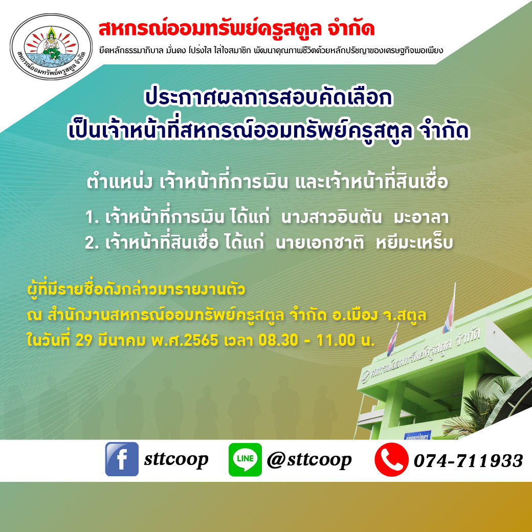 บัดนี้ ทางสหกรณ์ออมทรัพย์ครูสตูล ได้ดำเนินการสอบคัดเลือกเสร็จเรียบร้อยแล้ว จึงประกาศผลการสอบคัดเลือก ดังนี้
