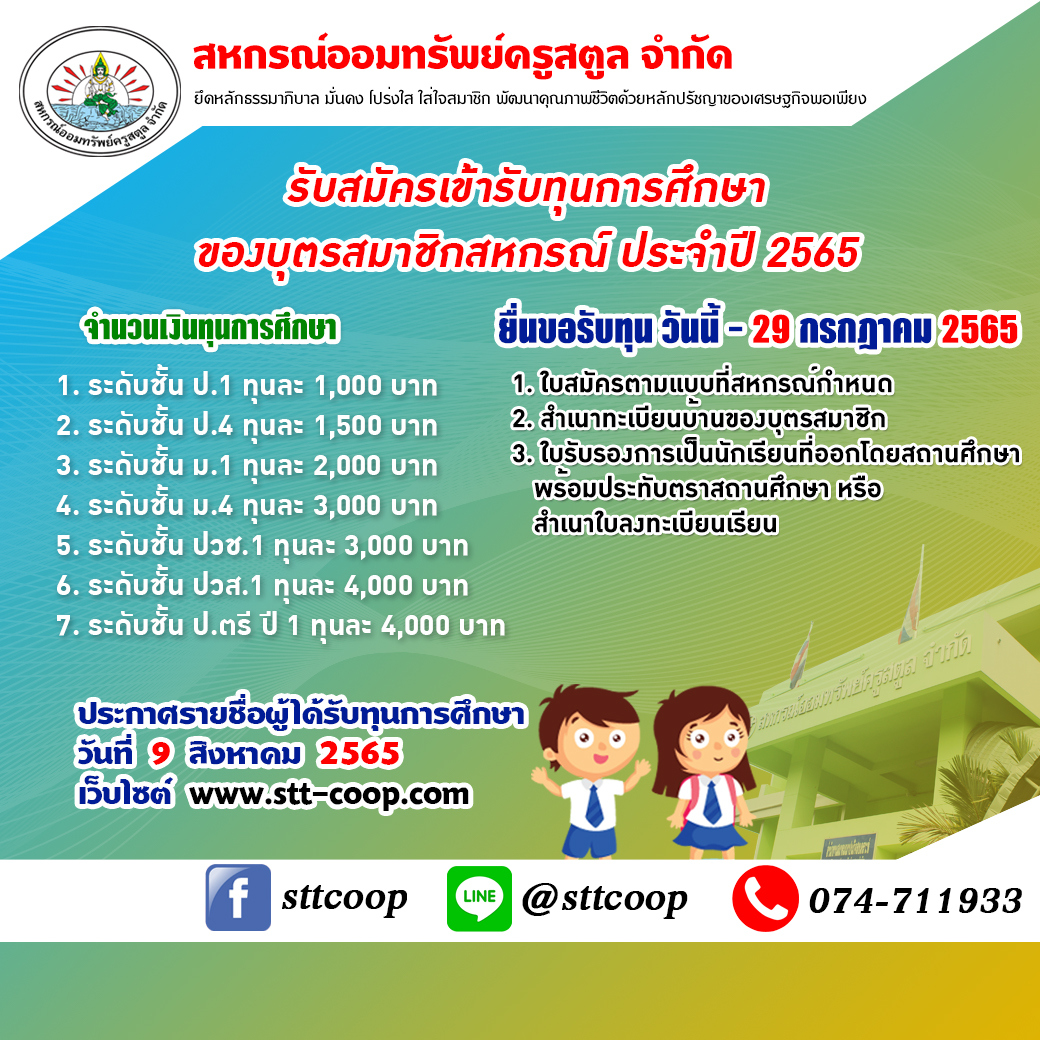ด้วยสหกรณ์ออมทรัพย์ครูสตูล จำกัด โดยมติที่ประชุมคณะกรรมการดำเนินการ ชุดที่ 56 ครั้งที่ 6/2565 เมื่อวันที่ 24 พฤษภาคม พ.ศ. 2565 มีมติให้สหกรณ์ฯ ประกาศรับสมัครบุตรของสมาชิกสหกรณ์ออมทรัพย์ครูสตูล จำกัด เข้ารับทุนการศึกษาประจำปี 2565 โดยรับสมัครตั้งแต่วันที่ 1 มิถุนายน – 29 กรกฎาคม 2565 ในวันและเวลาทำการ ณ สำนักงานสหกรณ์ออมทรัพย์ครูสตูล จำกัด และสำนักงานสหกรณ์ออมทรัพย์ครูสตูล จำกัด สาขาละงู