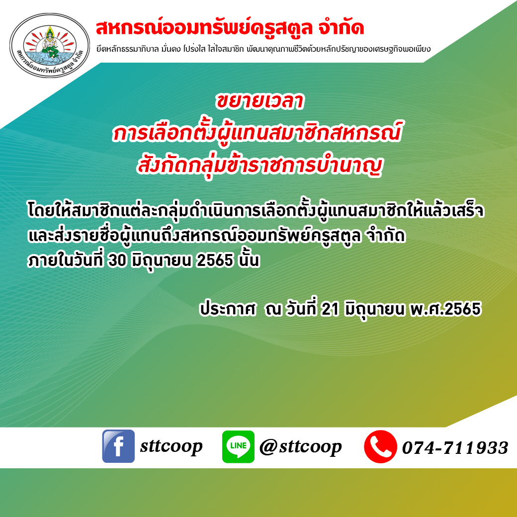 ตามที่สหกรณ์ออมทรัพย์ครูสตูล จำกัด ได้มีประกาศ เรื่อง การเลือกตั้งผู้แทนสหกรณ์ ลงวันที่ 8 มิถุนายน 2565 โดยให้สมาชิกแต่ละกลุ่มดำเนินการเลือกตั้งผู้แทนสมาชิกให้แล้วเสร็จ และส่งรายชื่อผู้แทนถึงสหกรณ์ออมทรัพย์ครูสตูล จำกัด ภายในวันที่ 30 มิถุนายน 2565 นั้น
