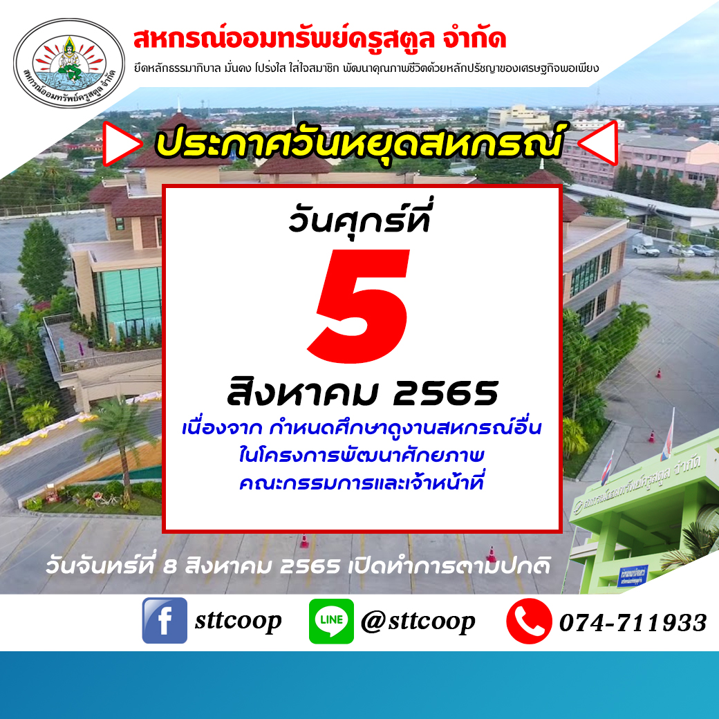 ด้วยสหกรณ์ออมทรัพย์ครูสตูล จำกัด อาศัยมติที่ประชุมคณะกรรมการดำเนินการชุดที่ 56 ครั้งที่ 8/2565 เมื่อวันที่ 22 กรกฎาคม พ.ศ. 2565 ได้มีมติกำหนดจัดกิจกรรมศึกษาดูงานสหกรณ์อื่น ภายใต้โครงการพัฒนาศักยภาพกรรมการและเจ้าหน้าที่