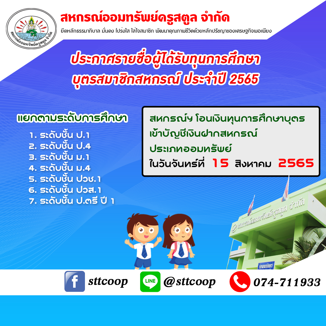 ด้วยสหกรณ์ออมทรัพย์ครูสตูล จำกัด โดยมติที่ประชุมคณะกรรมการดำเนินการ มีมติให้ สหกรณ์ฯประกาศรับสมัครบุตรสมาชิกสหกรณ์ออมทรัพย์ครูสตูล จำกัด เข้ารับทุนการศึกษาปี 2565 โดยเปิดรับสมัครตั้งแต่วันที่ 1 มิถุนายน – 29 กรกฎาคม 2565 ที่ผ่านมานั้น