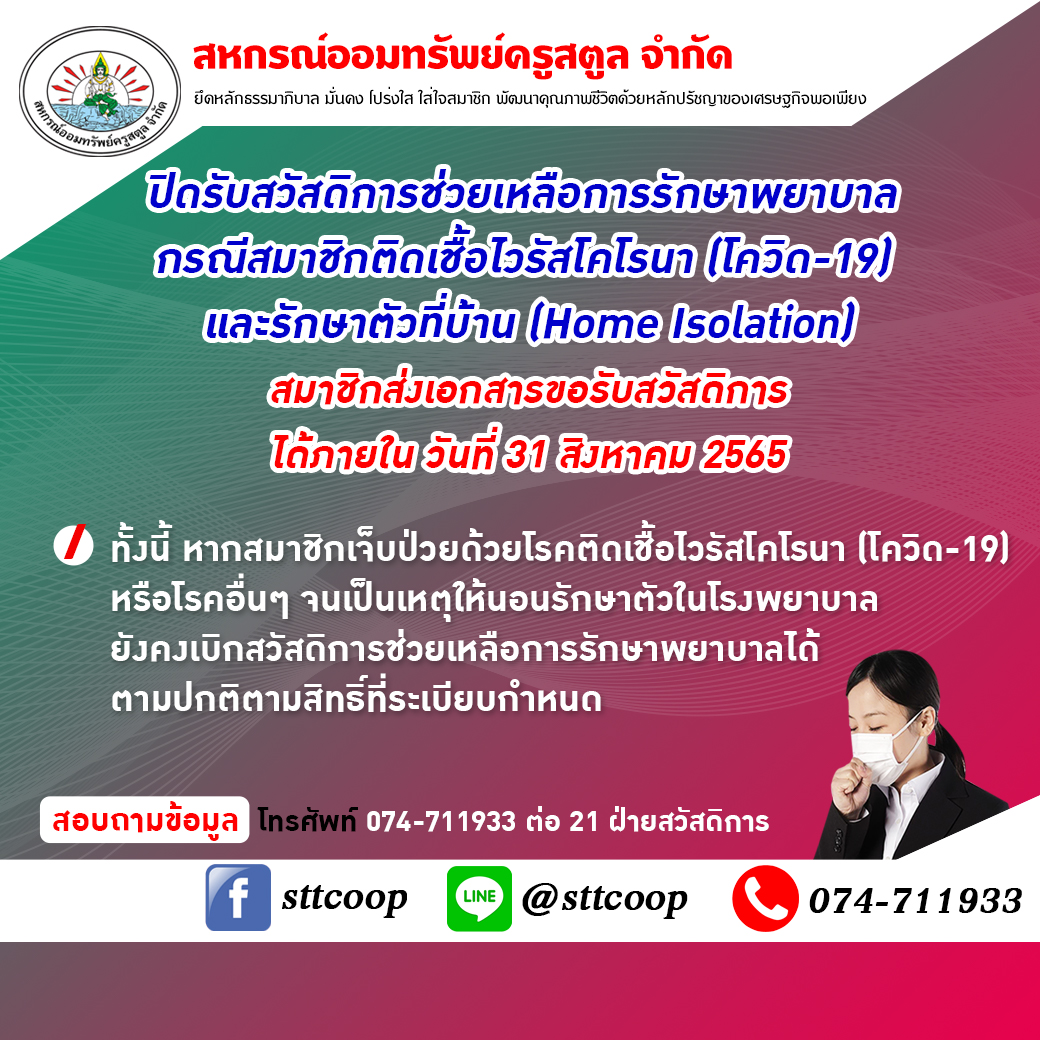 ตามที่สหกรณ์ออมทรัพย์ครูสตูล จำกัด ได้จัดให้มีสวัสดิการช่วยเหลือการรักษาพยาบาล เพื่อช่วยเหลือเยียวยากรณีสมาชิกรักษาตัวเป็นผู้ป่วยในของโรงพยาบาล รวมไปถึงช่วยเหลือสมาชิกที่ป่วยด้วยโรคติดเชื้อไวรัสโคโรนา 2019 (โควิด-19) ที่เข้าสู่ระบบสาธารณสุข และให้มีการรักษาตัวแบบ Home Isolation ด้วย นั้น