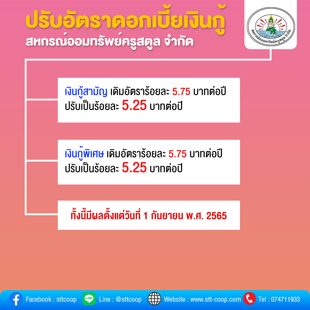 ด้วยสหกรณ์ออมทรัพย์ครูสตูล จำกัด โดยมติที่ประชุมคณะกรรมการดำเนินการสหกรณ์ออมทรัพย์ ครูสตูล จำกัด ชุดที่ 56 ในคราวประชุมครั้งที่ 10/2565 เมื่อวันที่ 24 สิงหาคม พ.ศ.2565 มีมติเป็นเอกฉันท์ให้สหกรณ์ออมทรัพย์ครูสตูล จำกัด ปรับลดอัตราดอกเบี้ยเงินกู้