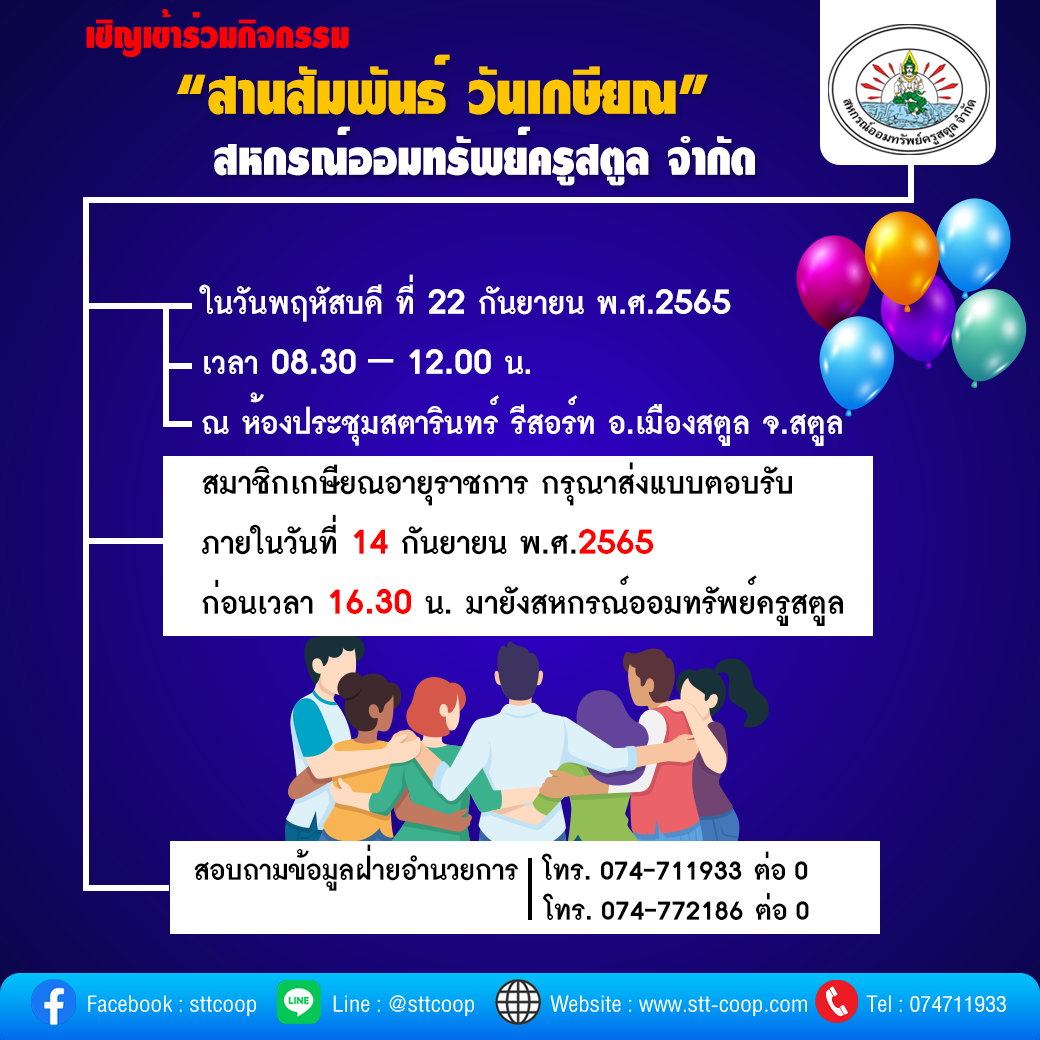ด้วยสหกรณ์ออมทรัพย์ครูสตูล จำกัด ได้กำหนดจัดกิจกรรม “สานสัมพันธ์ วันเกษียณ” สำหรับสมาชิกสหกรณ์ออมทรัพย์ครูสตูล จำกัด เพื่อให้สมาชิกได้รับทราบข้อมูลสิทธิประโยชน์สวัสดิการต่างๆ และรับฟังการบรรยายพิเศษ “หัวข้อ สุขสันต์ วันเกษียณ” สหกรณ์ออมทรัพย์ครูสตูล จำกัด จึงขอเชิญสมาชิกผู้เกษียณอายุและลาออกจากราชการ ประจำปี2565 แจ้งความประสงค์เข้าร่วมงานในวันพฤหัสบดี ที่ 22 กันยายน พ.ศ.2565 เวลา 08.30 – 12.00 น. ณ ห้องประชุมสตารินทร์ รีสอร์ท อ.เมืองสตูล จ.สตูล