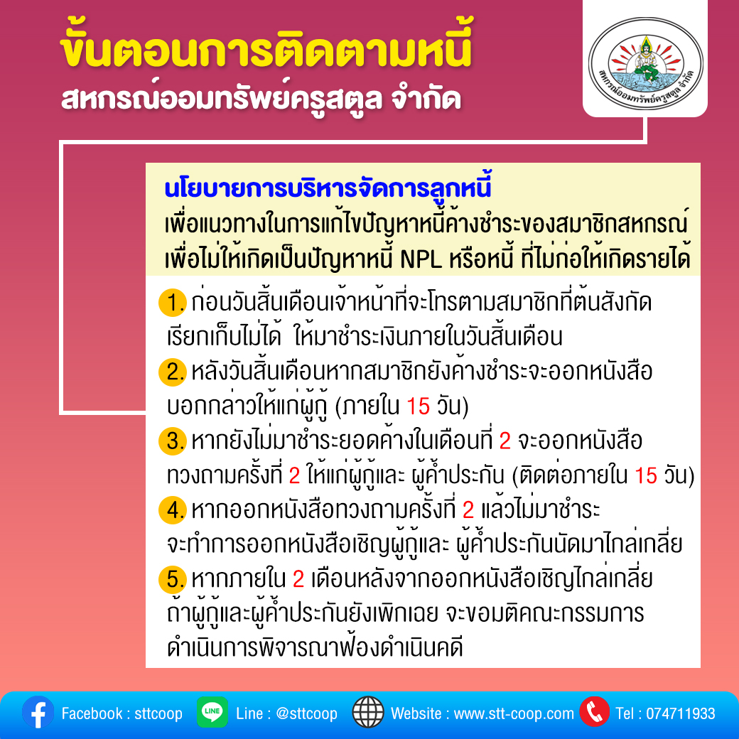 ด้วยสหกรณ์ออมทรัพย์ครูสตูล จำกัด ได้มีนโยบายการบริหารจัดการลูกหนี้ เพื่อแนวทางในการแก้ไขปัญหาหนี้ค้างชำระของสมาชิกสหกรณ์ เพื่อไม่ให้เกิดเป็นปัญหาหนี้ NPL (Non Profit Loan) หรือหนี้ ที่ไม่ก่อให้เกิดรายได้ นั้น สหกรณ์ออมทรัพย์ครูสตูล จำกัด โดยมติที่ประชุมคณะกรรมการดำเนินการสหกรณ์ออมทรัพย์ครูสตูล จำกัด ชุดที่ 56 ครั้งที่ 9/2565 เมื่อวันที่ 26 กรกฎาคม 2565 จึงได้กำหนดขั้นตอนการติดตามหนี้