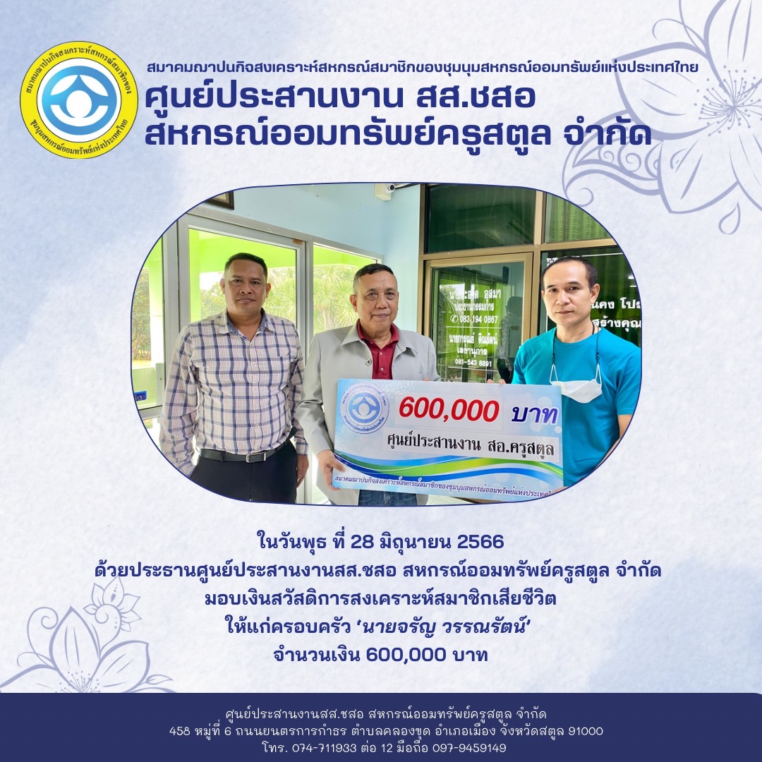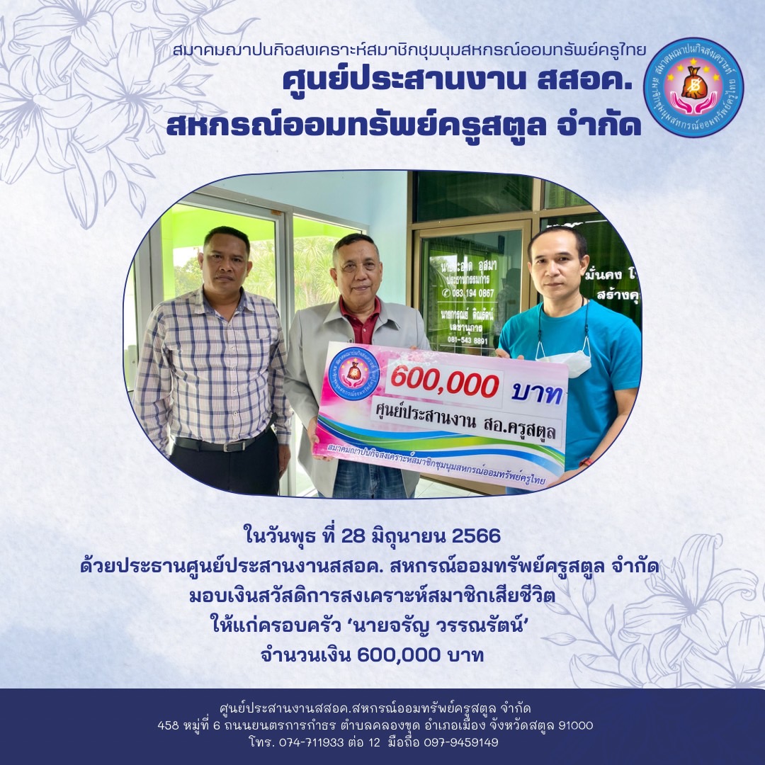 ด้วยประธานศูนย์ประสานงานสมาคมฌาปนกิจสงเคราะห์ สส.ชสอ. สหกรณ์ออมทรัพย์ครูสตูล จำกัด มอบเงินสวัสดิการสงเคราะห์สมาชิกเสียชีวิต ให้แก่ครอบครัว ‘นายจรัญ วรรณรัตน์’ จำนวนเงิน 600,000 บาทและ มอบเงินสวัสดิการสงเคราะห์สมาชิกเสียชีวิต สมาคมฌาปนกิจสงเคราะห์สหกรณ์ สสอค. ให้แก่ครอบครัว ‘นายจรัญ วรรณรัตน์’ จำนวนเงิน 600,000 บาท