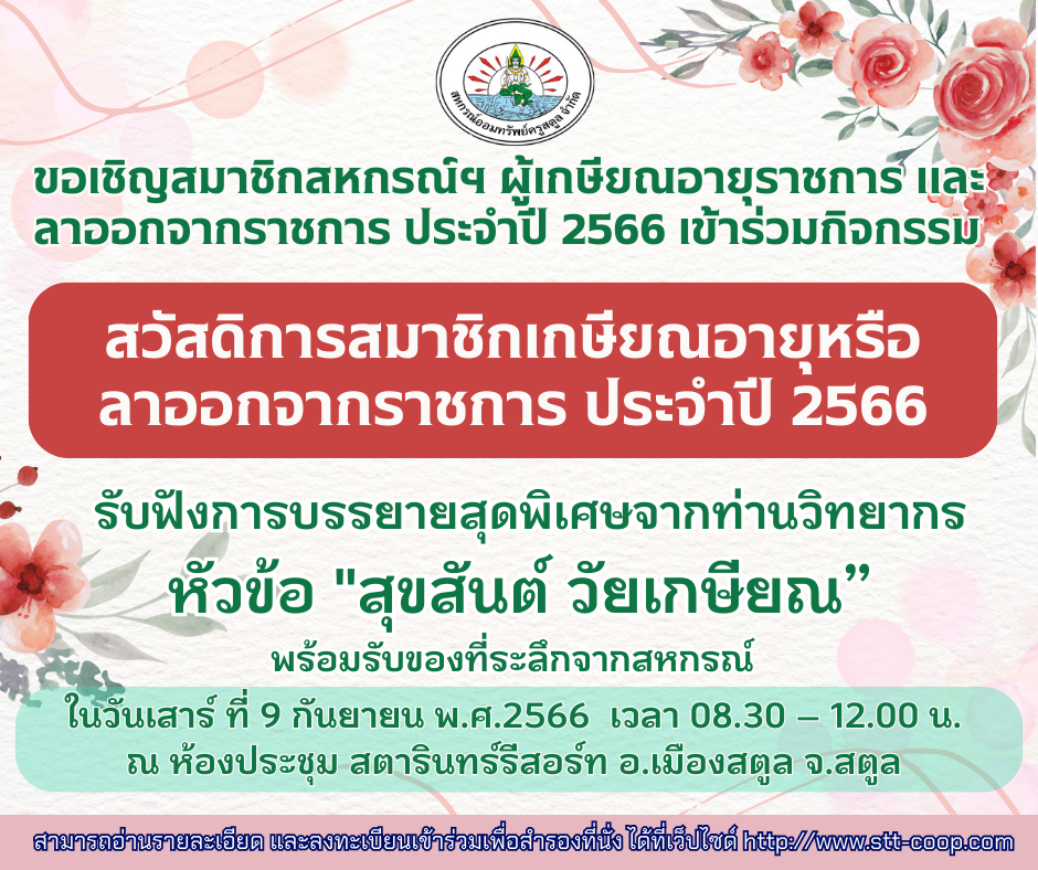 ด้วยสหกรณ์ออมทรัพย์ครูสตูล จำกัด ได้กำหนดจัดกิจกรรม สวัสดิการสมาชิกเกษียณอายุหรือลาออกจากราชการ ประจำปี2566 เพื่อให้สมาชิกได้รับทราบข้อมูลสิทธิประโยชน์สวัสดิการต่างๆ และรับฟังการบรรยายพิเศษจากท่านวิทยากร “หัวข้อ สุขสันต์ วัยเกษียณ” สหกรณ์ออมทรัพย์ครูสตูล จำกัด จึงขอเชิญสมาชิก ผู้เกษียณอายุและลาออกจากราชการ ประจำปี2566 เข้าร่วมงาน ในวันเสาร์ ที่ 9 กันยายน พ.ศ.2566 เวลา 08.30 – 12.00 น. ณ ห้องประชุม สตารินทร์รีสอร์ท อ.เมืองสตูล จ.สตูล