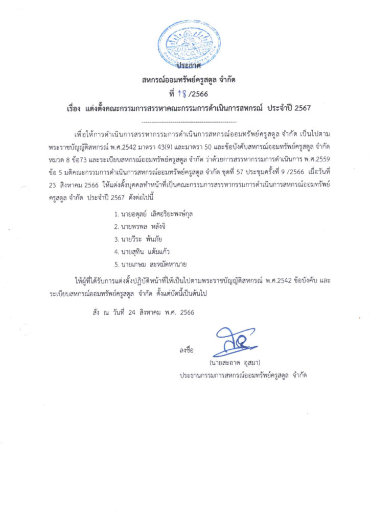 ประกาศ แต่งตั้งคณะกรรมการสรรหาคณะกรรมการดำเนินการสหกรณ์ ประจำปี2567