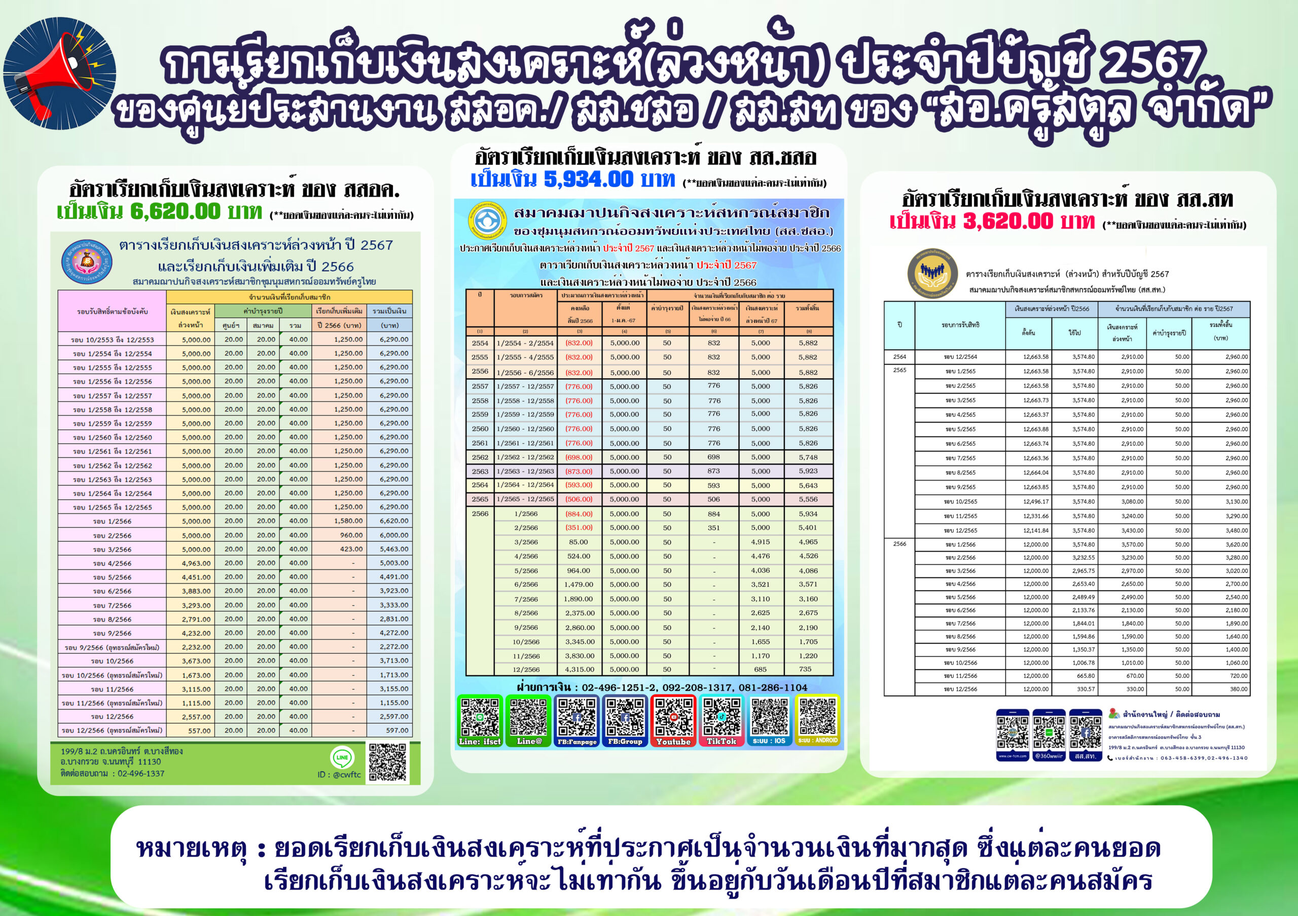 ด้วยสหกรณ์ออมทรัพย์ครูสตูล จำกัด ได้เป็นศูนย์ประสานงานของสมาคมฌาปนกิจสงเคราะห์สหกรณ์สมาชิกชุมนุมสหกรณ์ออมทรัพย์ครูไทย (สสอค.) และสมาคมฌาปนกิจสงเคราะห์สหกรณ์สหกรณ์สมาชิกของชุมนุมสหกรณ์ออมทรัพย์แห่งประเทศไทย (สส.ชสอ.) ขอความร่วมมือทางโรงเรียนและหน่วยงานประชาสัมพันธ์ เรื่อง การเรียกเก็บเงินสงเคราะห์ สำหรับปีบัญชี 2567 โดยกำหนดชำระเงินตั้งแต่วันที่ 1-19 ธันวาคม 2566 (สำหรับสมาชิกหักปันผลทางสหกรณ์ฯ จะหักปันผลของสมาชิกโดยอัตโนมัติ)
