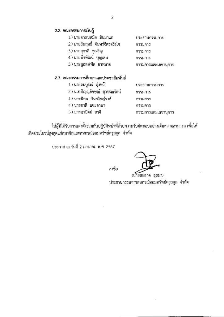 ด้วยสหกรณ์ออมทรัพย์ครูสตูล จำกัด โดยมติที่ประชุมคณะกรรมการดำเนินการ ครั้งที่ 1/2567 เมื่อวันที่ 28 ธันวาคม พ.ศ.2566 มีมติแต่งตั้งคณะกรรมการดำเนินการตำแหน่งต่างๆ และแต่งตั้งคณะกรรมการดำเนินการฝ่ายต่างๆ ของสหกรณ์ออมทรัพย์ครูสตูล จำกัด – ตามไฟล์ที่แนบมาด้วยนั้น