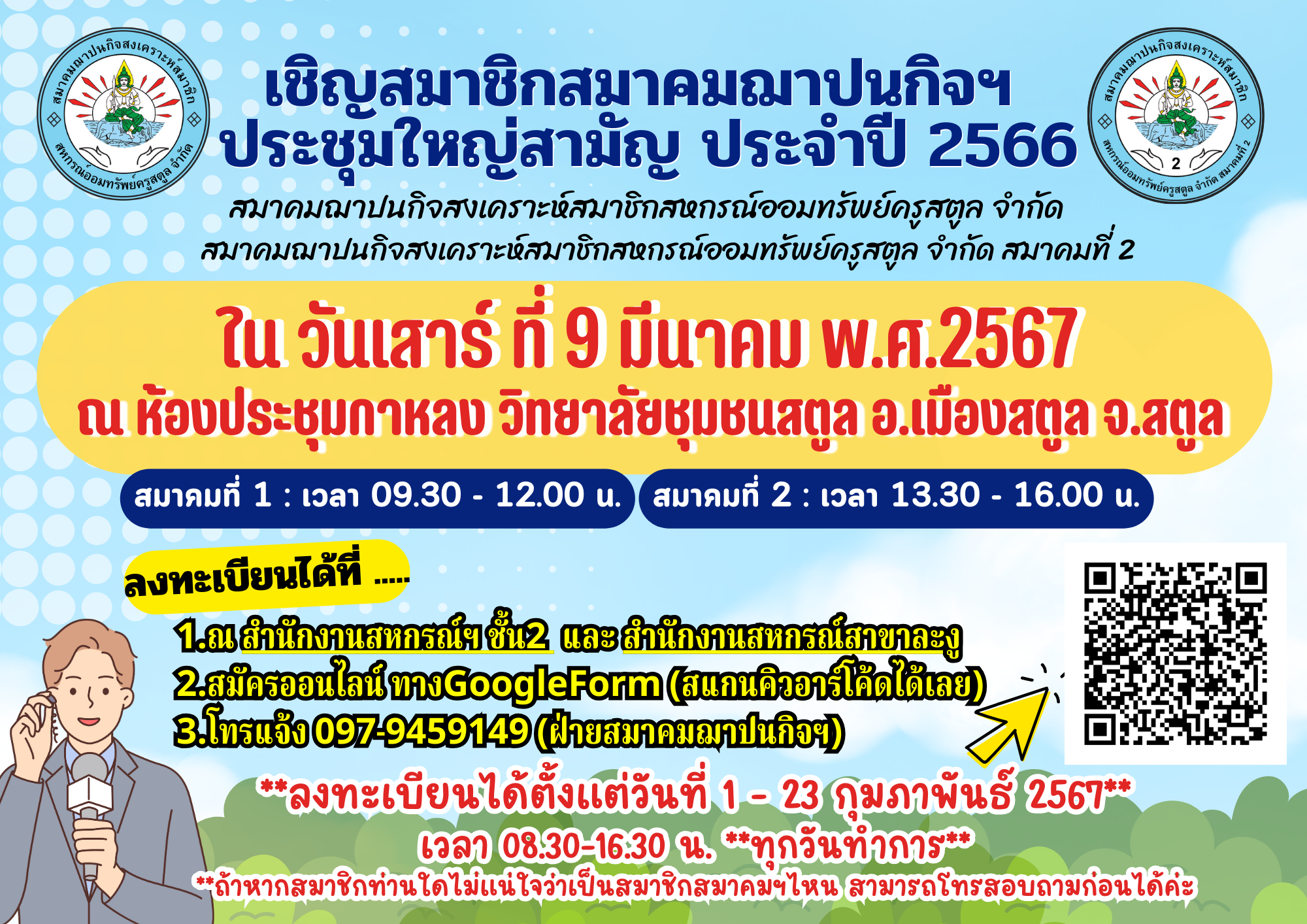 เชิญสมาชิกสมาคมฯ ลงทะเบียนประชุมใหญ่สามัญประจำปี 2566 สมาคมฌาปนกิจฯ สมาคม 1 และสมาคม 2