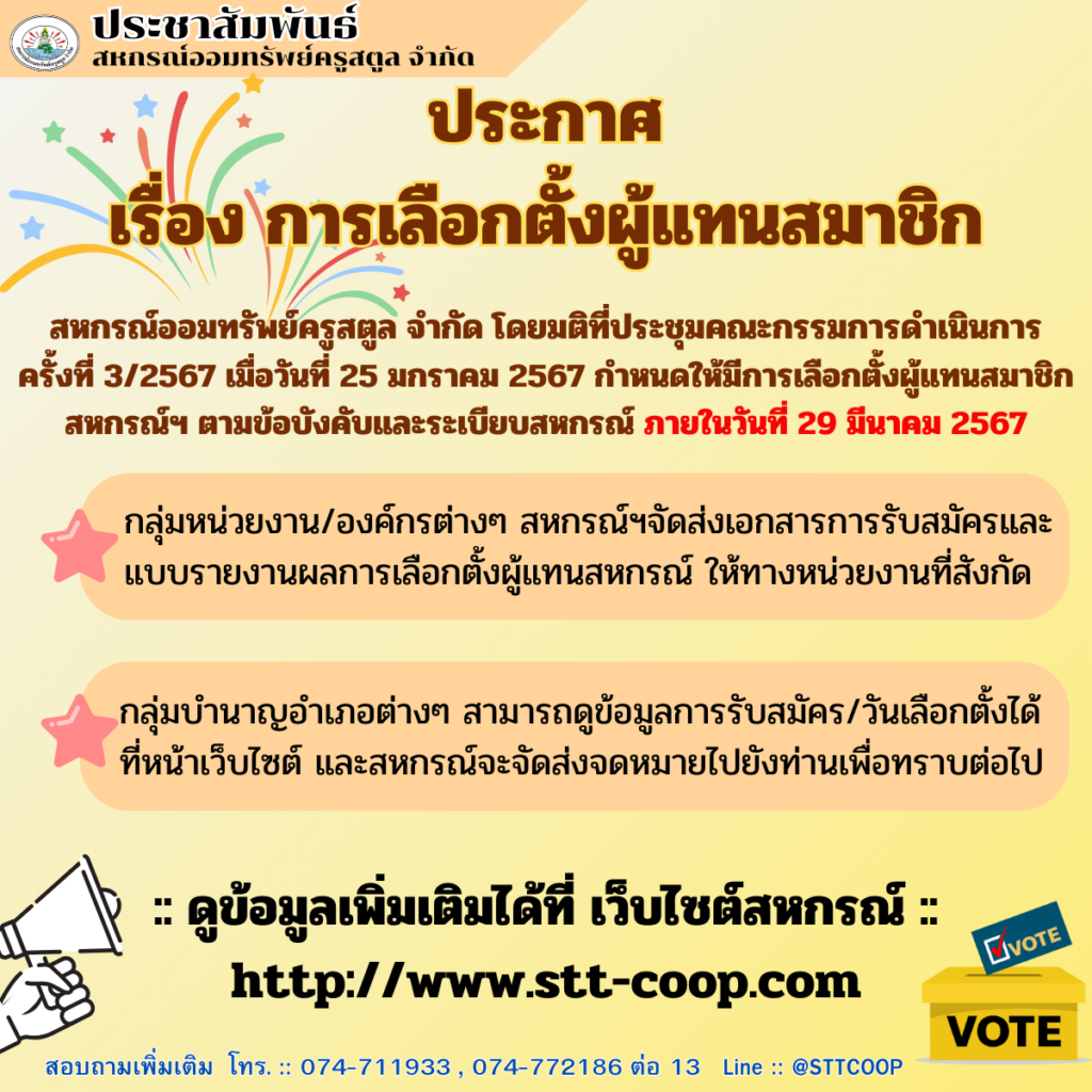 ด้วยสหกรณ์ออมทรัพย์ครูสตูล จำกัด ได้กำหนดให้มีการเลือกตั้งผู้แทนสมาชิกตามข้อบังคับ และระเบียบของสหกรณ์ โดยกำหนดให้แต่ละหน่วยงาน/กลุ่มบำนาญอำเภอต่างๆ ดำเนินการเลือกตั้งและแจ้งรายชื่อผู้แทนต่อสหกรณ์ออมทรัพย์ครูสตูล จำกัด (นำส่งแบบรายงานผลการเลือกตั้งผู้แทนและใบสมัครผู้แทนสมาชิก) ภายในวันที่ 29 มีนาคม 2567