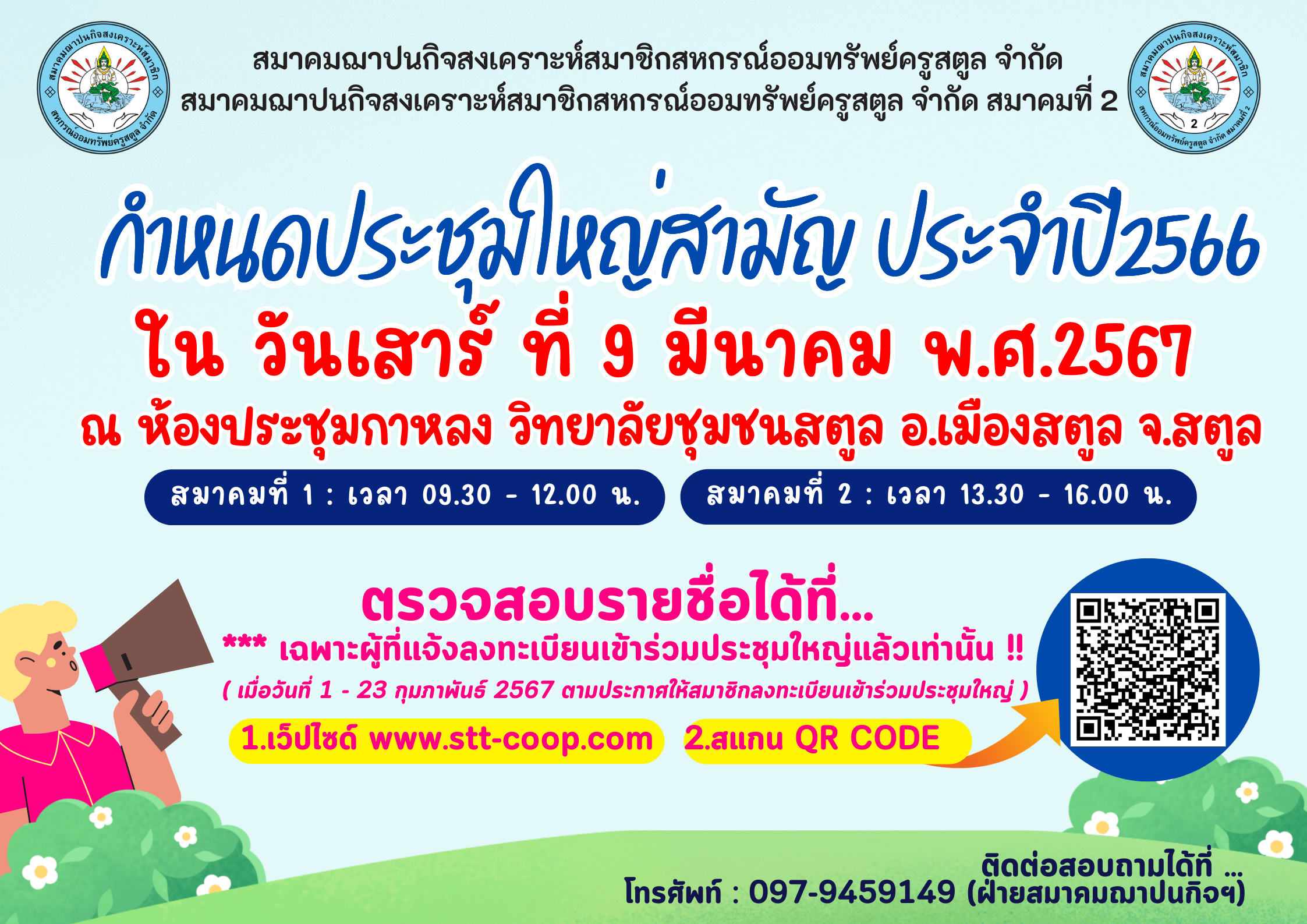 จึงขอเรียนเชิญสมาชิกสมาคมฌาปนกิจสงเคราะห์สมาชิกสหกรณ์ออมทรัพย์ครูสตูล จำกัด สมาคมที่ 1 และ สมาชิกสมาคมฌาปนกิจสงเคราะห์สมาชิกสหกรณ์ออมทรัพย์ครูสตูล จำกัด สมาคมที่ 2 เข้าร่วมประชุมใหญ่สามัญประจำปี 2566 ตามวันเวลาและสถานที่ดังกล่าวข้างต้นต่อไป โดยสมาชิกสามารถตรวจสอบรายชื่อได้ทาง www.stt-coop.com หรือ Scan QR Cord