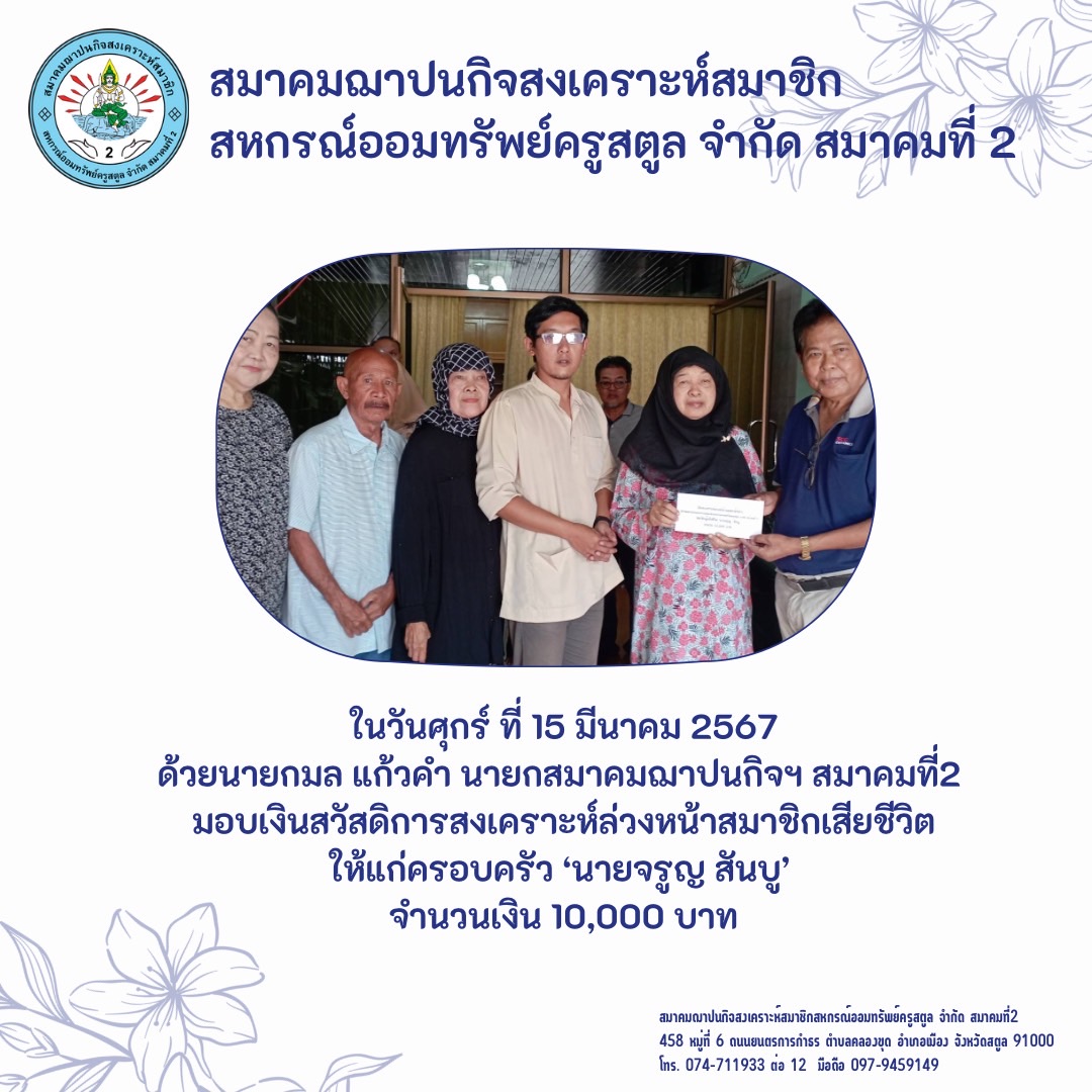 ในวันศุกร์ ที่ 15 มีนาคม 2567 ด้วย นายกมล แก้วคำ นายกสมาคมฌาปนกิจฯ สมาคมที่ 2 มอบเงินสวัสดิการสงเคราะห์ล่วงหน้าสมาชิกเสียชีวิต ให้แก่ครอบครัว ‘นายจรูญ สันบู’ จำนวนเงิน 10,000 บาท