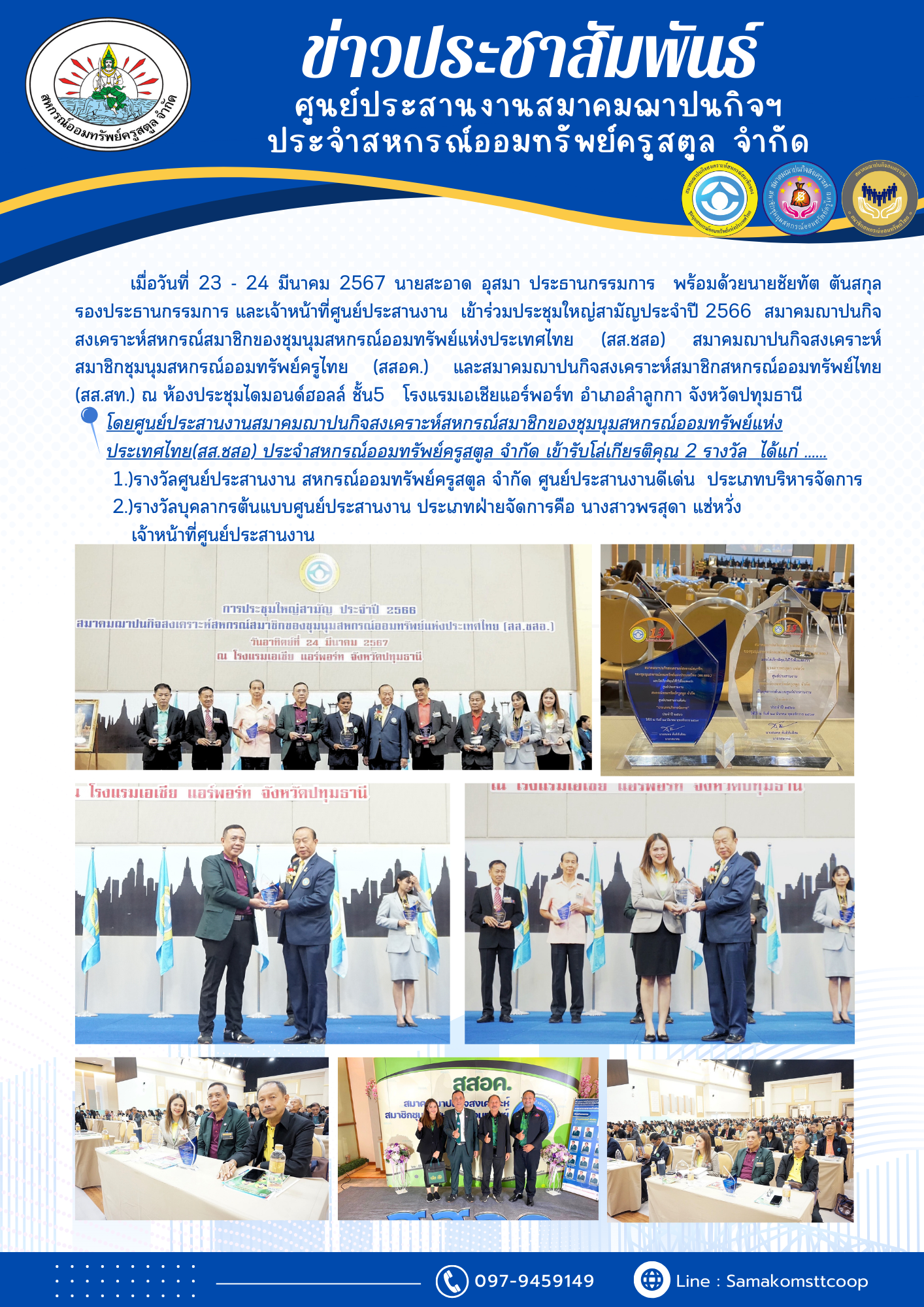 1.)รางวัลศูนย์ประสานงาน สหกรณ์ออมทรัพย์ครูสตูล จำกัด ศูนย์ประสานงานดีเด่น ประเภทบริหารจัดการ