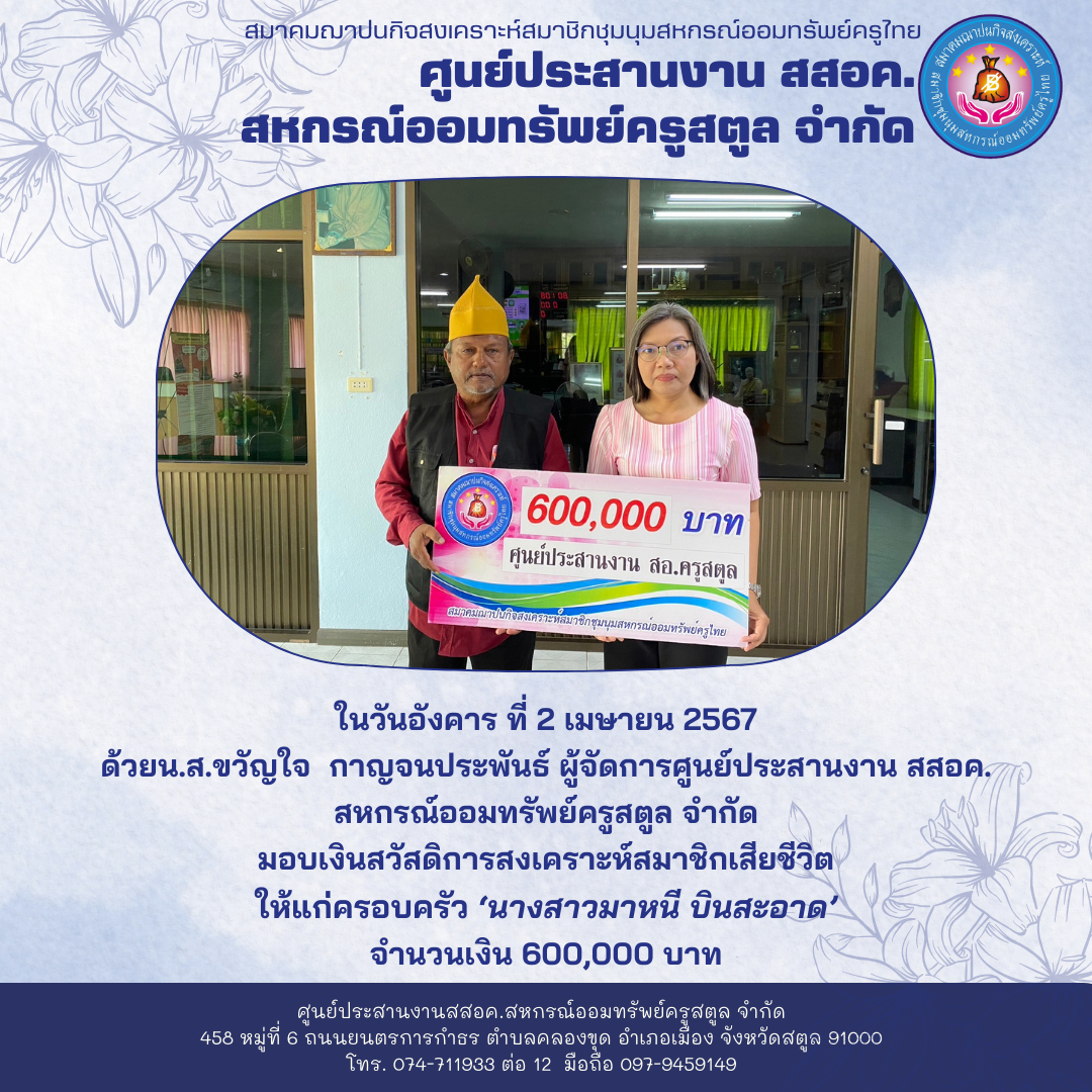 ในวันอังคาร ที่ 2 เมษายน 2567 ด้วยน.ส.ขวัญใจ กาญจนประพันธ์ ผู้จัดการศูนย์ประสานงาน สสอค. สหกรณ์ออมทรัพย์ครูสตูล จำกัด มอบเงินสวัสดิการสงเคราะห์สมาชิกเสียชีวิต ให้แก่ครอบครัว “นางสาวมาหนี บินสะอาด” จำนวนเงิน 600,000 บาท