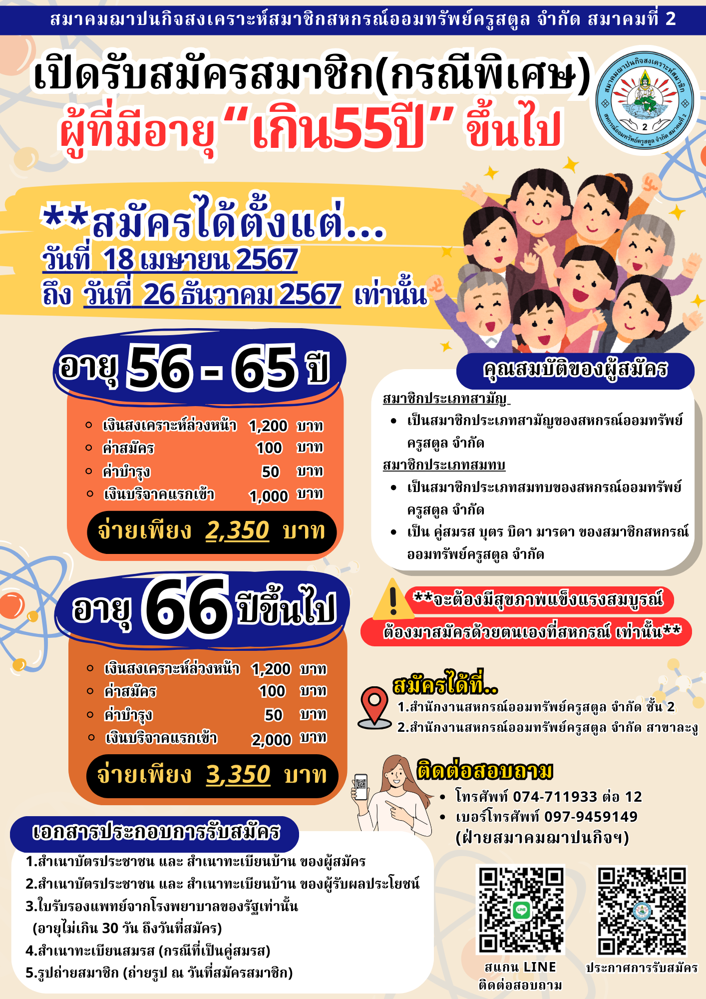 มติที่ประชุมคณะกรรมการดำเนินการคราวประชุม ชุดที่5 ครั้งที่1/2566 เมื่อวันที่ 30 พฤษภาคม พ.ศ.2566 มีมติกำหนดให้มีการรับสมัครสมาชิกสมาคมฌาปนกิจสงเคราะห์สมาชิกสหกรณ์ออมทรัพย์ครูสตูล จำกัด สมาคมที่ 2 (กรณีพิเศษ) ให้เป็นไปตามข้อบังคับฯ เปิดรับสมัครตั้งแต่วันที่ 18 เมษายน 2567 – วันที่ 26 ธันวาคม 2567 เนื่องในโอกาสมหามงคลเฉลิมพระชนมพรรษาพระบาทสมเด็จพระเจ้าอยู่หัว ทรงเจริญพระชนมพรรษา 6 รอบ หรือ 72 พรรษา ในวันที่ 28 กรกฎาคม 2567 มีมติให้เปิดรับสมัครสมาชิกสมาคมฯ (กรณีพิเศษ)