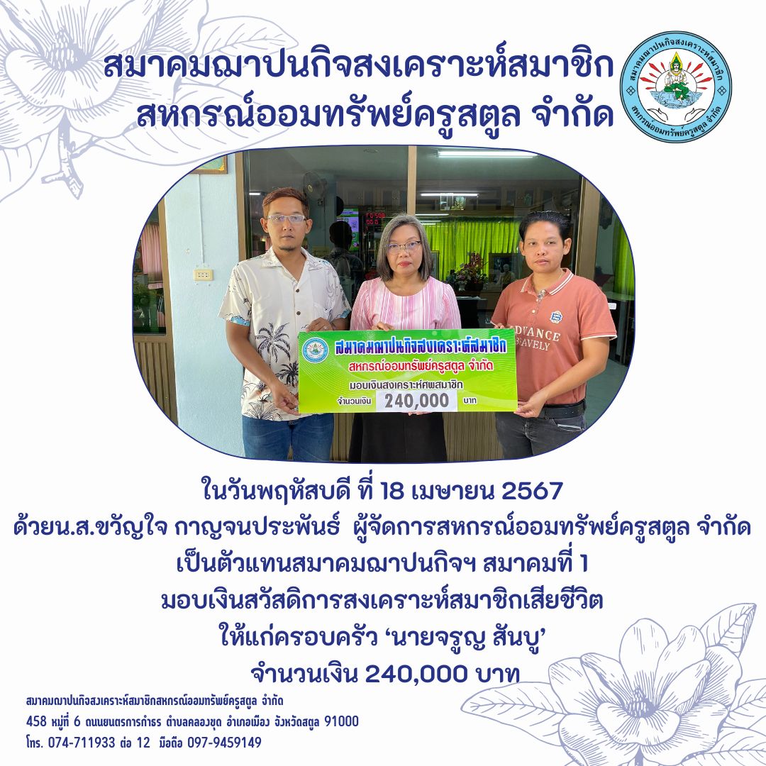 ในวันพฤหัสบดี ที่ 18 เมษายน 2567 ด้วยน.ส.ขวัญใจ กาญจนประพันธ์ ผู้จัดการสหกรณ์ออมทรัพย์ครูสตูล จำกัดเป็นตัวแทนสมาคมฌาปนกิจฯ สมาคมที่ 1 มอบเงินสวัสดิการสงเคราะห์สมาชิกเสียชีวิต ให้แก่ครอบครัว ‘นายจรูญ สันบู’ จำนวนเงิน 240,000 บาท