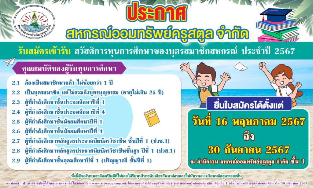 ประกาศรับสมัครเข้ารับทุนการศึกษาของบุตรของสมาชิกสหกรณ์ออมทรัพย์ครูสตูล จำกัด ประจำปี 2567 โดยรับสมัครตั้งแต่วันที่ 16 พฤษภาคม – 30 กันยายน 2567 ในวันและเวลาทำการ ณ สำนักงานสหกรณ์ออมทรัพย์ครูสตูล จำกัด และสำนักงานสหกรณ์ออมทรัพย์ครูสตูล จำกัด สาขาละงู