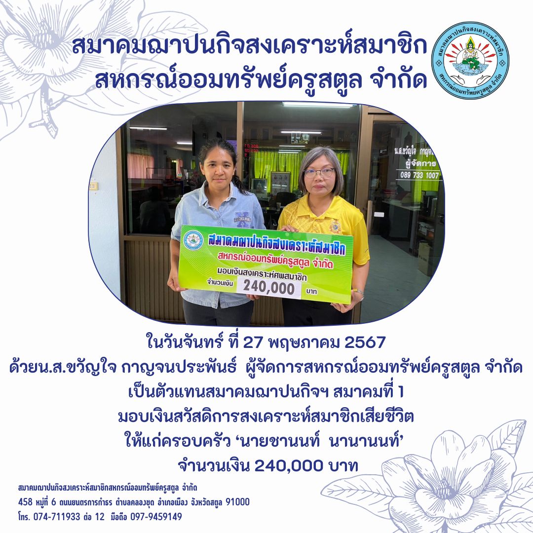 ในวันจันทร์ ที่ 27 พฤษภาคม 2567 ด้วยน.ส.ขวัญใจ กาญจนประพันธ์ ผู้จัดการสหกรณ์ออมทรัพย์ครูสตูล จำกัดเป็นตัวแทนสมาคมฌาปนกิจฯ สมาคมที่ 1 มอบเงินสวัสดิการสงเคราะห์สมาชิกเสียชีวิต ให้แก่ครอบครัว ‘นายชานนท์ นานานนท์’ จำนวนเงิน 240,000 บาท