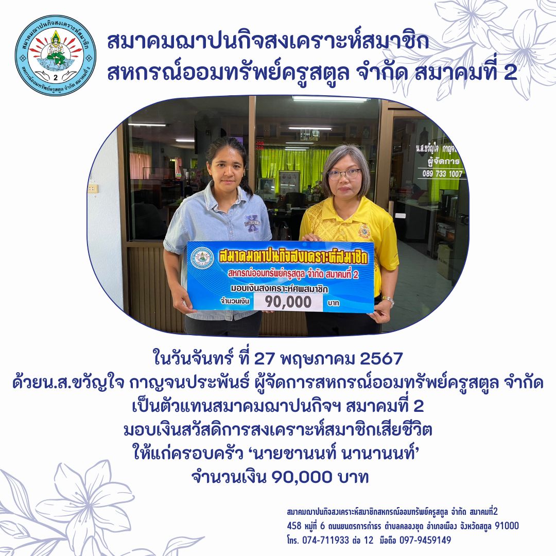 ในวันจันทร์ ที่ 27 พฤษภาคม 2567 ด้วยน.ส.ขวัญใจ กาญจนประพันธ์ ผู้จัดการสหกรณ์ออมทรัพย์ครูสตูล จำกัดเป็นตัวแทนสมาคมฌาปนกิจฯ สมาคมที่ 2 มอบเงินสวัสดิการสงเคราะห์สมาชิกเสียชีวิต ให้แก่ครอบครัว ‘นายชานนท์ นานานนท์’ จำนวนเงิน 90,000 บาท