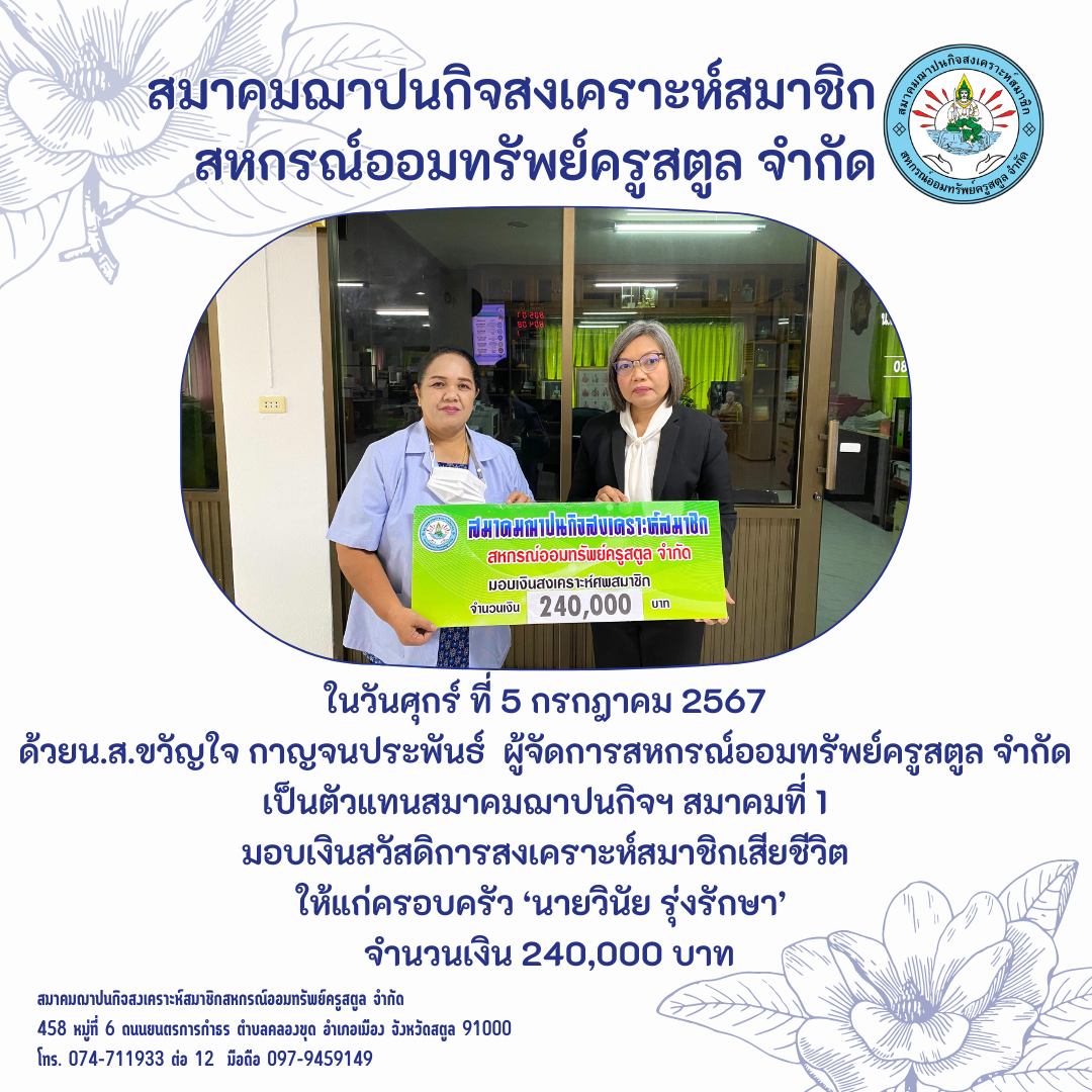 ในวันศุกร์ ที่ 5 กรกฏาคม 2567 ด้วยน.ส.ขวัญใจ กาญจนประพันธ์ ผู้จัดการสหกรณ์ออมทรัพย์ครูสตูล จำกัดเป็นตัวแทนสมาคมฌาปนกิจฯ สมาคมที่ 1 มอบเงินสวัสดิการสงเคราะห์สมาชิกเสียชีวิต ให้แก่ครอบครัว ‘นายวินัย รุ่งรักษา’ จำนวนเงิน 240,000 บาท