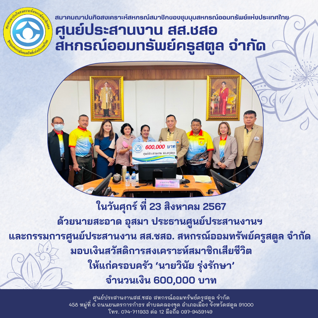 ในวันศุกร์ ที่ 23 สิงหาคม 2567 ด้วยนายสะอาด อุสมา ประธานศูนย์ประสานงานฯและกรรมการศูนย์ประสานงาน สส.ชสอ สหกรณ์ออมทรัพย์ครูสตูล จำกัด มอบเงินสวัสดิการสงเคราะห์สมาชิกเสียชีวิต ให้แก่ครอบครัว “นายวินัย รุ่งรักษา” จำนวนเงิน 600,000 บาท