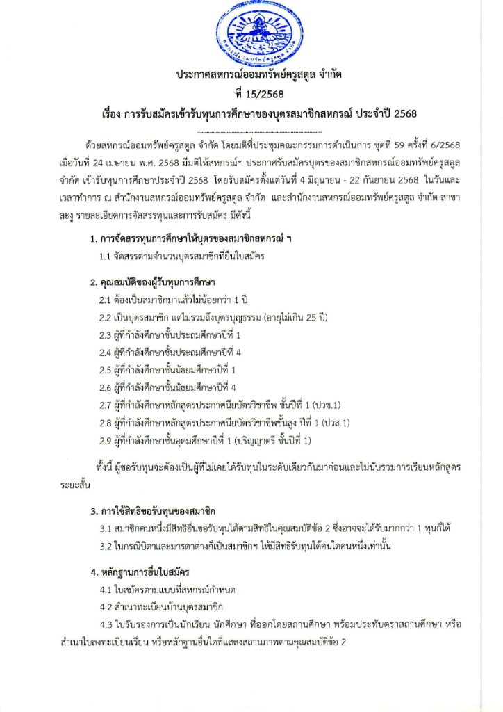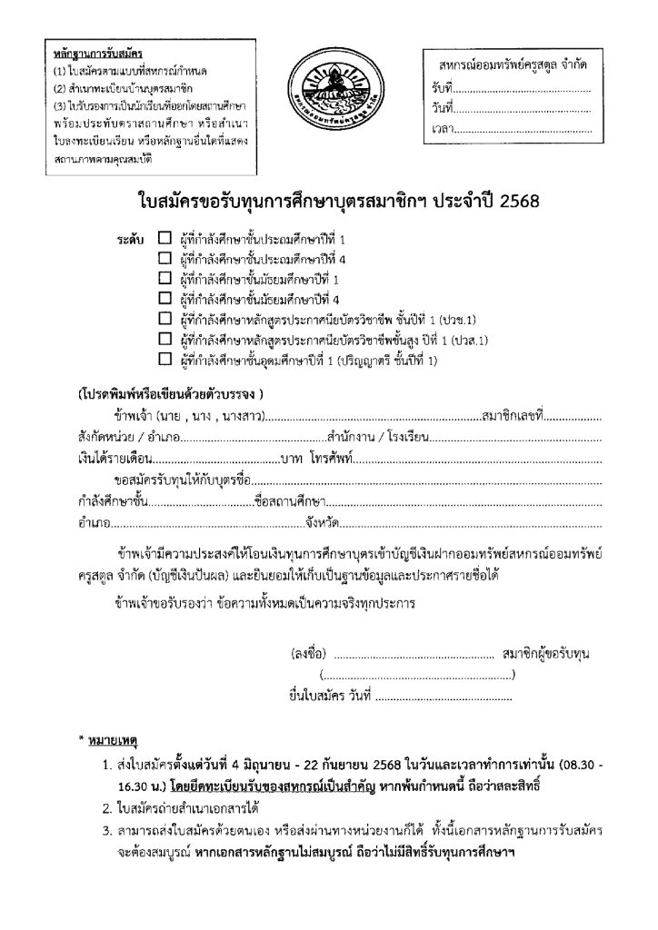 หน้าแรก ข่าวประชาสัมพันธ์ ประกาศ การรับสมัครเข้ารับทุนการศึกษาของบุตรสมาชิกสหกรณ์ ประจำปี 2568 ข่าวประชาสัมพันธ์ ประกาศ การรับสมัครเข้ารับทุนการศึกษาของบุตรสมาชิกสหกรณ์ ประจำปี 2568 4 มิถุนายน 2025 2711 0 แบ่งปัน FacebookTwitterPinterestWhatsApp ดาวน์โหลดเอกสาร >> ประกาศรับสมัครทุนการศึกษบุตรสมาชิก 2568