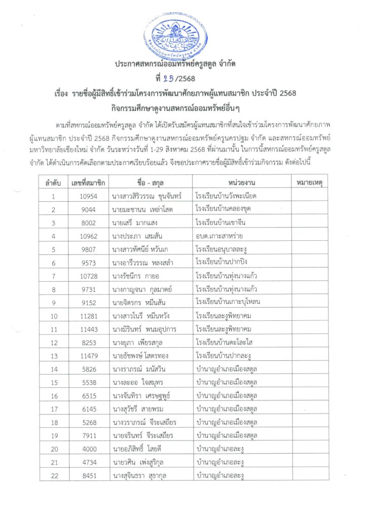หน้าแรก ข่าวประชาสัมพันธ์ ประกาศ รายชื่อผู้มีสิทธิ์เข้าร่วมโครงการพัฒนาศักยภาพผู้แทนสมาชิก ประจำปี 2568 ข่าวประชาสัมพันธ์ ประกาศ รายชื่อผู้มีสิทธิ์เข้าร่วมโครงการพัฒนาศักยภาพผู้แทนสมาชิก ประจำปี 2568 3 กันยายน 2025 744 0 แบ่งปัน FacebookTwitterPinterestWhatsApp ดาวน์โหลด ไฟล์ >> ประกาศ รายชื่อผู้มีสิทธิ์เข้าร่วมกิจกรรมศึกษาดูงาน ประจำปี 2568