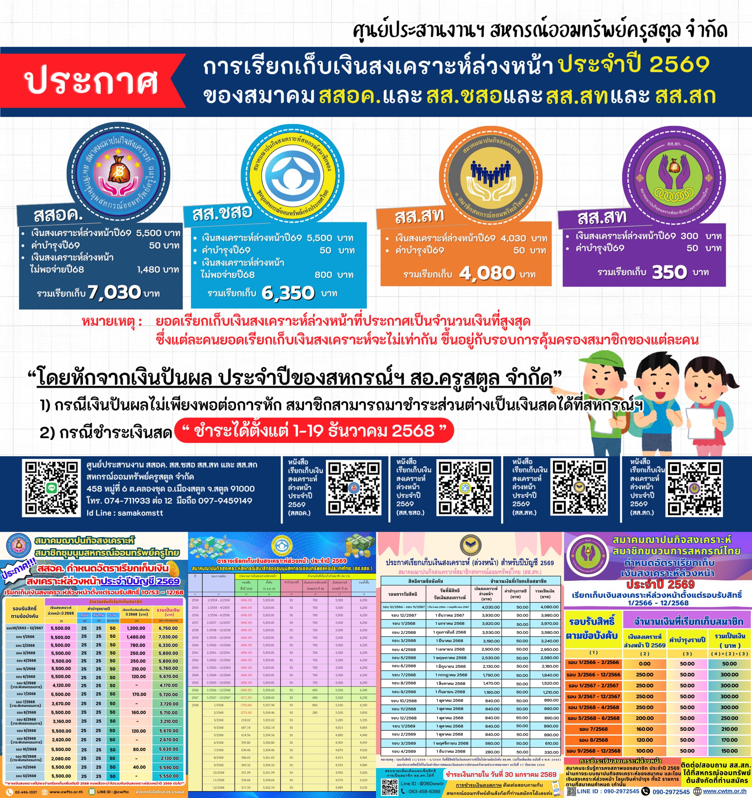 ด้วยสหกรณ์ออมทรัพย์ครูสตูล จำกัด ได้เป็นศูนย์ประสานงานของสมาคมฌาปนกิจสงเคราะห์สหกรณ์สมาชิกชุมนุมสหกรณ์ออมทรัพย์ครูไทย (สสอค.) และ สมาคมฌาปนกิจสงเคราะห์สหกรณ์สหกรณ์สมาชิกของชุมนุมสหกรณ์ออมทรัพย์แห่งประเทศไทย (สส.ชสอ.) และสมาคมฌาปนกิจสงเคราะห์สมาชิกสหกรณ์ออมทรัพย์ไทย (สส.สท) และสมาคมฌาปนกิจสงเคราะห์สมาชิกขบวนการสหกรณ์ไทย (สส.สก.) ขอความร่วมมือทางโรงเรียนและหน่วยงานประชาสัมพันธ์ เรื่อง การเรียกเก็บเงินสงเคราะห์ สำหรับปีบัญชี 2569