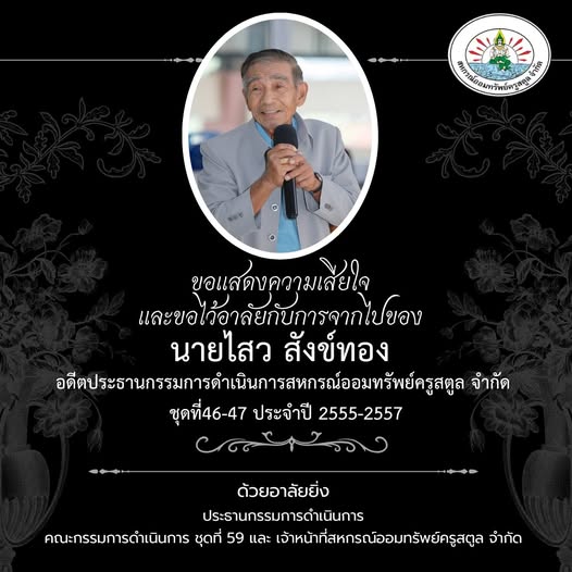 สหกรณ์ออมทรัพย์ครูสตูล จำกัด ขอแสดงความเสียใจ กับการจากไปของ นายนายไสว สังข์ทอง (อดีตประธานกรรมการดำเนินการสหกรณ์ออมทรัพย์ครูสตูล จำกัด ชุดที่ 46-47 ประจำปี 2555-2557) และครอบครัวอย่างสุดซึ้ง ด้วยความเคารพและอาลัยอย่างสุดซึ้ง