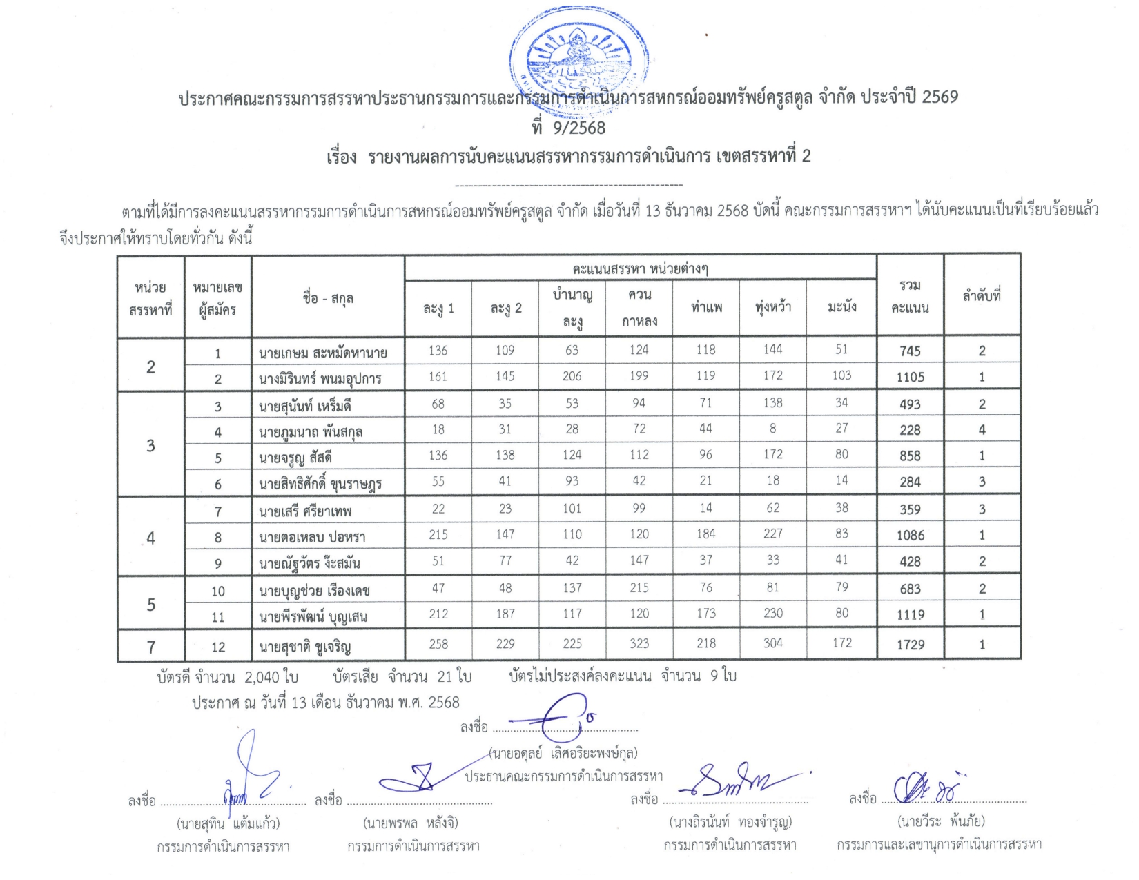 ตามที่ได้มีการลงคะแนนสรรหากรรมการดำเนินการสหกรณ์ออมทรัพย์ครูสตูล จำกัด เมื่อวันที่ 13 ธันวาคม 2568 บัดนี้ คณะกรรมการสรรหาฯ ได้นับคะแนนเป็นที่เรียบร้อยแล้ว