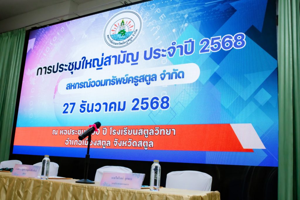 สหกรณ์ออมทรัพย์ครูสตูล จำกัด นำโดยท่านประธานสหกรณ์ นายสะอาด อุสมา จัดการประชุมใหญ่สามัญประจำปี 2568 ในวันเสาร์ ที่ 27 ธันวาคม พ.ศ.2568 ณ หอประชุม 100 ปี โรงเรียนสตูลวิทยา อำเภอเมืองสตูล จังหวัดสตูล โดยมีกิจกรรม มอบใบประกาศเกียรติคุณให้แก่โรงเรียนที่ได้รับรางวัล “โครงการส่งเสริมระบบสหกรณ์ออมทรัพย์ของโรงเรียน”