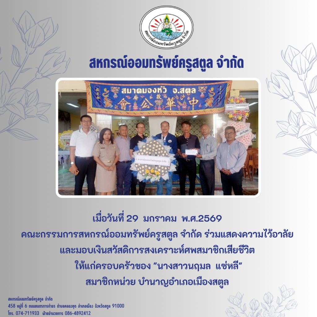 หน้าแรก มอบเงินเกี่ยวกับสวัสดิการ ร่วมแสดงความไว้อาลัยสมาชิกเสียชีวิต ให้แก่ครอบครัวของ “นางสาวนฤมล แซ่หลี” สมาชิกหน่วย บำนาญอำเภอเมืองสตูล มอบเงินเกี่ยวกับสวัสดิการ ร่วมแสดงความไว้อาลัยสมาชิกเสียชีวิต ให้แก่ครอบครัวของ “นางสาวนฤมล แซ่หลี” สมาชิกหน่วย บำนาญอำเภอเมืองสตูล 30 มกราคม 2026 7 0 แบ่งปัน FacebookTwitterPinterestWhatsApp