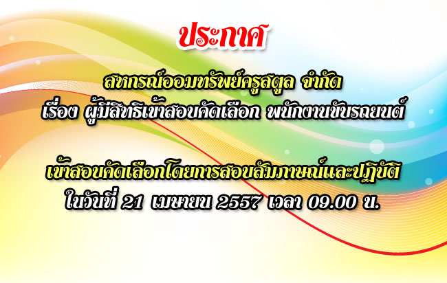 ด้วยสหกรณ์ออมทรัพย์ครูสตูล จำกัด โดติที่ประชุมคณะกรรมการดำเนินการ ชุดที่ 48 ครั้งที่ 3/2557 เมื่อวันที่ 25 มีนาคม 2557 ได้ประกาศรับสมัครบุคคลทั่วไป เพื่อสอบคัดเลือกเป็นลูกจ้างสหกรณ์ฯ ตำแหน่ง พนักงานขับรถยนต์ จำนวน 1 อัตรา ตามประกาศ ณ วันที่ 26 มีนาคม พ.ศ. 2557 และได้เปิดรับสมัครในวันที่ 31 มีนาคม – 8 เมษายน พ.ศ. 2557 บัดนี้การรับสมัครแล้วเสร็จ คณะกรรมการได้ตรวจสอบหลักฐานของผู้สมัครแล้ว มีผู้สมัครที่ได้ยื่นหลักฐาน, เอกสาร และมีคุณวุฒิ ถูกต้องตามประกาศของสหกรณ์ออมทรัพย์ครูสตูล จำกัด