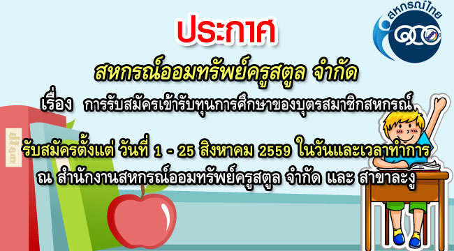 ด้วยสหกรณ์ออมทรัพย์ครูสตูล จำกัด โดยมติที่ประชุมคณะกรรมการดำเนินการ ครั้งที่ 7/2559 เมื่อวันที่ 25 กรกฎาคม พ.ศ. 2559 มีมติให้สหกรณ์ฯ ประกาศรับสมัครบุตรของสมาชิกสหกรณ์ออมทรัพย์ครูสตูล จำกัด เข้ารับทุนการศึกษาประจำปี 2559 โดยรับสมัครตั้งแต่วันที่ 1 – 25 สิงหาคม 2559 ในวันและเวลาทำการ ณ สำนักงานสหกรณ์ออมทรัพย์ครูสตูล จำกัด และสำนักงานสหกรณ์ออมทรัพย์ครูสตูล จำกัด สาขาละงู รายละเอียดการจัดสรรทุนและการรับสมัคร ดังนี้