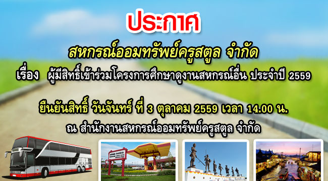 ด้วยสหกรณ์ออมทรัพย์ครูสตูล จำกัด โดยมติที่ประชุมคณะกรรมการดำเนินการ มีมติให้ สหกรณ์ฯ ประกาศรับสมัครสมาชิกผู้สนใจเข้าร่วมโครงการศึกษาดูงานสหกรณ์อื่น ประจำปี 2559 รับสมัครตั้งแต่วันที่ 26-28 กันยายน 2559 ที่ผ่านมานั้น สหกรณ์ออมทรัพย์ครูสตูล จำกัด ขอประกาศรายชื่อผู้มีสิทธิ์เข้าร่วมโครงการศึกษาดูงานสหกรณ์อื่นของสมาชิก ประจำปี 2559 ทั้งนี้ ให้ผู้มีรายนามดังกล่าว มายืนยันสิทธิ์เข้าร่วมโครงการฯ และรับฟังคำชี้แจงรายละเอียดต่างๆ ด้วยตัวเอง ในวันจันทร์ ที่ 3 ตุลาคม 2559 เวลา 14.00 น. ณ สำนักงานสหกรณ์ออมทรัพย์ครูสตูล จำกัด