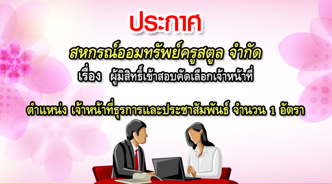 ด้วยสหกรณ์ออมทรัพย์ครูสตูล จำกัด ได้ประกาศรับสมัครบุคคลทั่วไป เพื่อสอบคัดเลือกเป็นเจ้าหน้าที่สหกรณ์ออมทรัพย์ครูสตูล จำกัด ตำแหน่ง เจ้าหน้าที่ธุรการและประชาสัมพันธ์ จำนวน 1 อัตรา ประกาศ ณ วันที่ 28 กุมภาพันธ์ พ.ศ.2560 และรับสมัครในวันที่ 1-10 มีนาคม 2560