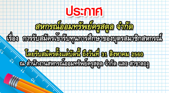 ด้วยสหกรณ์ออมทรัพย์ครูสตูล จำกัด โดยมติที่ประชุมคณะกรรมการดำเนินการ ครั้งที่ 11/2560 เมื่อวันที่ 21 มิถุนายน พ.ศ. 2560 มีมติให้สหกรณ์ฯ ประกาศรับสมัครบุตรของสมาชิกสหกรณ์ออมทรัพย์ครูสตูล จำกัด เข้ารับทุนการศึกษาประจำปี 2560 โดยรับสมัครตั้งแต่บัดนี้ ถึงวันที่ 31 สิงหาคม 2560 ในวันและเวลาทำการ ณ สำนักงานสหกรณ์ออมทรัพย์ครูสตูล จำกัด และสำนักงานสหกรณ์ออมทรัพย์ครูสตูล จำกัด สาขาละงู รายละเอียดการจัดสรรทุนและการรับสมัคร