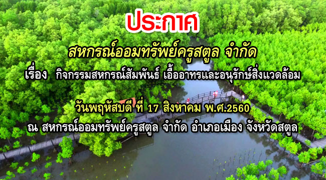 ด้วยสหกรณ์ออมทรัพย์ครูสตูล จำกัด โดยที่ประชุมใหญ่สามัญประจำปี 2559 ได้อนุมัติโครงการเอื้ออาทรสังคมและสิ่งแวดล้อม และโครงการเสริมสร้างอาชีพ มีวัตถุประสงค์เพื่อส่งเสริมและกระตุ้นจิตสำนึกการมีส่วนร่วมของเยาวชนในจังหวัดให้ตระหนักและเล็งเห็นคุณค่าของการอนุรักษ์สิ่งแวดล้อม และเป็นการเปิดโอกาสให้เยาวชนได้แสดงความสามารถในเชิงสร้างสรรค์ รวมไปถึงกิจกรรมการเสริมสร้างอาชีพให้แก่สมาชิกสหกรณ์ สนับสนุนให้มีการฝึกอบรมในการทำอาชีพเสริม เพื่อเป็นการใช้เวลาว่างให้เป็นประโยชน์ โดยจัดขึ้นในวันที่ 17 สิงหาคม 2560 ณ สำนักงานสหกรณ์ออมทรัพย์ครูสตูล จำกัด อำเภอเมือง จังหวัดสตูล โดยในงานจะมีการจัดนิทรรศการต่างๆ และมีการจัดกิจกรรมการแข่งขันให้แก่นักเรียน นักศึกษา อาทิเช่น กิจกรรมประกวดสุนทรพจน์ กิจกรรมประกวดภาพวาด กิจกรรมประกวดเรียงความ