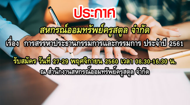 ด้วยสหกรณ์ออมทรัพย์ครูสตูล จํากัด จะดําเนินการสรรหาคณะกรรมการดําเนินการ ประจําปี 2561 และนําเสนอต่อที่ประชุมใหญ่สามัญประจําปี 2560 เพื่อเลือกตั้งเป็นคณะกรรมการดําเนินการ ประจําปี 2561 โดยให้เป็นไปตามพระราชบัญญัติสหกรณ์ พ.ศ.2542 ข้อบังคับ และระเบียบสหกรณ์ฯว่าด้วยการสรรหากรรมการดําเนินการ พ.ศ.2559 ฉะนั้น คณะกรรมการดําเนินการเลือกตั้งคณะกรรมการดําเนินการสหกรณ์ออมทรัพย์ครูสตูล จํากัด จึงรับสมัครสมาชิกเพื่อสรรหาเป็นคณะกรรมการดําเนินการแทนคณะกรรมการดําเนินการที่ออกตามวาระตามพระราชบัญญัติสหกรณ์ พ.ศ.2542 มาตรา 50 วรรคสอง
