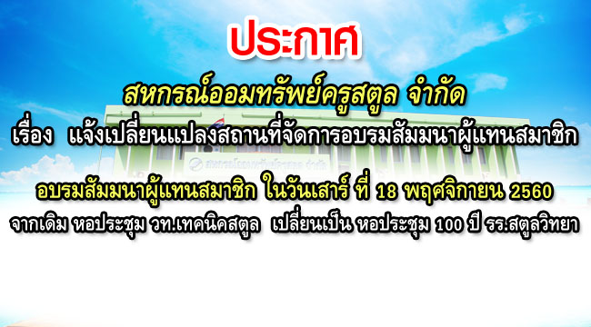 ตามที่สหกรณ์ออมทรัพย์ครูสตูล จำกัด กำหนดจัดโครงการอบรมสัมมนาผู้แทนสมาชิก ในวันเสาร์ ที่ 18 พฤศจิกายน 2560 เวลา 08.30 น. นั้น ทางสหกรณ์ใคร่ขอแจ้งเปลี่ยนสถานที่จัดการอบรมสัมมนาผู้แทนสมาชิก จากเดิม ณ หอประชุม วิทยาลัยเทคนิคสตูล อำเภอเมือง จังหวัดสตูล เปลี่ยนเป็น ณ หอประชุม 100 ปี โรงเรียนสตูลวิทยา อำเภอเมือง จังหวัดสตูล
