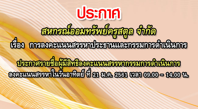ด้วยสหกรณ์ออมทรัพย์ครูสตูล จำกัด จะดำเนินการสรรหาประธานกรรมการและกรรมการดำเนินการ ประจำปี 2561 และนำเสนอต่อที่ประชุมใหญ่สามัญประจำปี 2560 เพื่อเลือกตั้งเป็นคณะกรรมการดำเนินการสหกรณ์ออมทรัพย์ครูสตูล จำกัด และสหกรณ์ได้ประกาศรายชื่อผู้มีสิทธิเข้ารับการสรรหาเป็นประธานกรรมการและกรรมการดำเนินการสหกรณ์ ประจำปี 2561 เมื่อวันที่ 1 ธันวาคม 2560 ไปแล้วนั้น เพื่อให้การลงคะแนนสรรหากรรมการดำเนินการสหกรณ์ฯ เป็นไปด้วยความถูกต้อง สหกรณ์จึงขอประกาศรายละเอียดการลงคะแนนสรรหาประธานกรรมการและกรรมการดำเนินการสหกรณ์ออมทรัพย์ครูสตูล จำกัด ประจำปี 2561