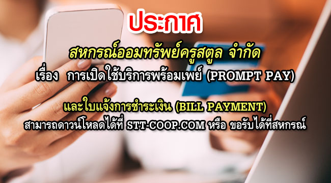 สหกรณ์ออมทรัพย์ครูสตูล จำกัด โดยคณะกรรมการดำเนินการได้กำหนดแนวทางเลือกในการชำระเงินต่างๆของสหกรณ์ผ่านทางอิเล็กทรอนิกส์ของธนาคารกรุงไทยและธนาคารธนชาต เพื่ออำนวยความสะดวกให้กับสมาชิกไม่ต้องเดินทางมายังสหกรณ์ สามารถดำเนินการผ่านทางธนาคารได้เลย โดยใช้แบบฟอร์มการชำระเงิน (Bill Payment) ของสหกรณ์ หรือการใช้บริการพร้อมเพย์ (Prompt Pay) ที่สหกรณ์ได้เปิดใช้บริการไว้
