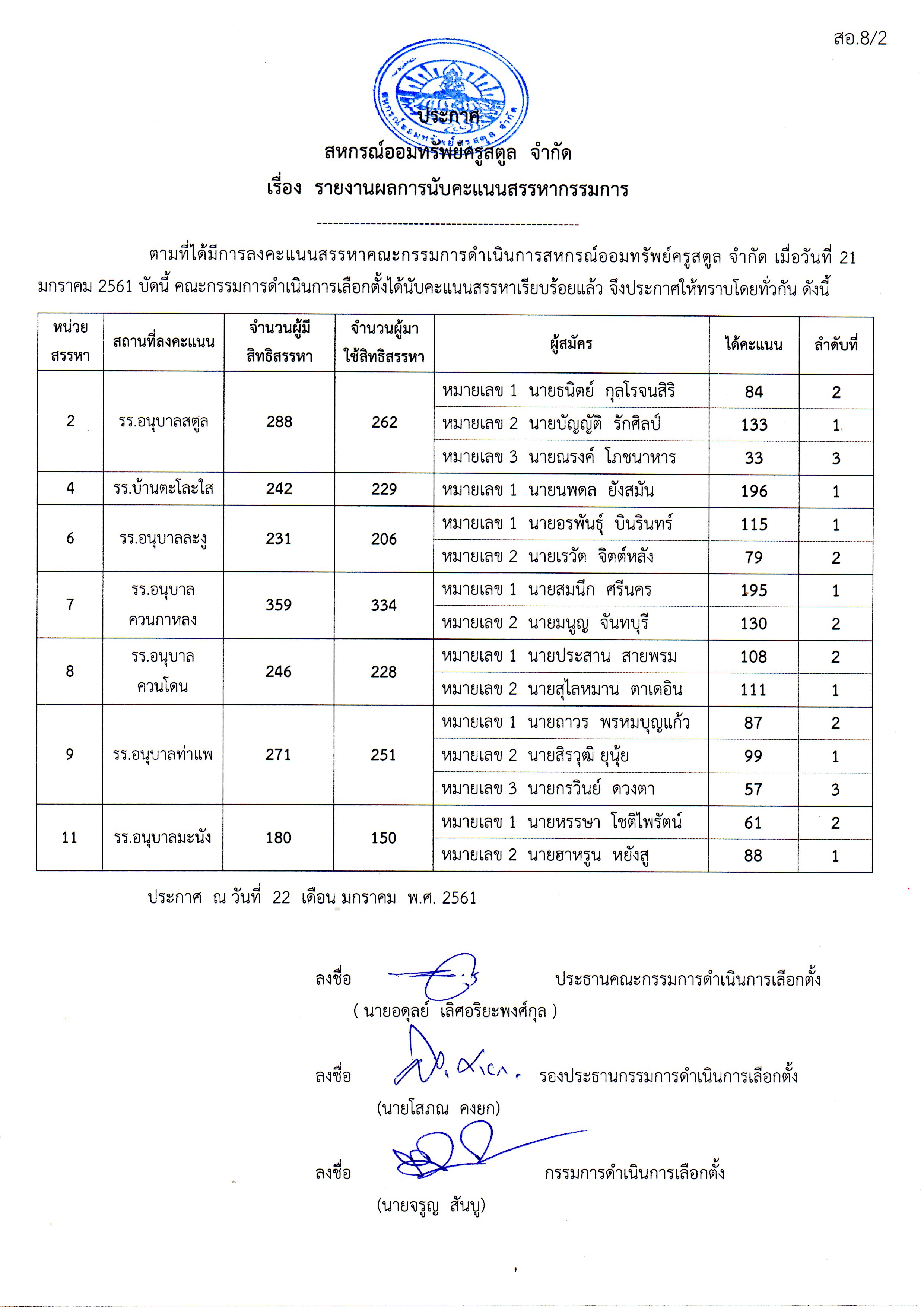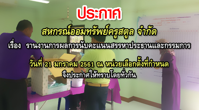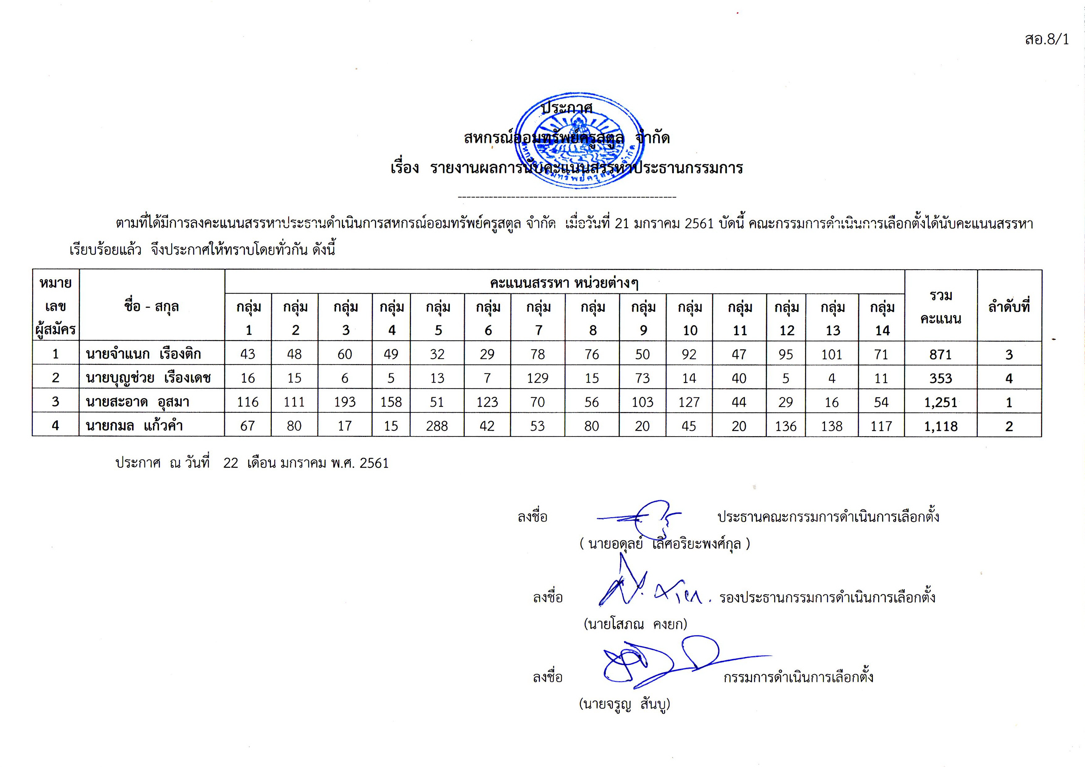 ตามที่สหกรณ์ได้จัดการลงคะแนนสรรหาเมื่อวันที่ 14 มกราคม 2561(ล่วงหน้า) และวันที่ 21 มกราคม 2561 ที่ผ่านมา เพื่อสรรหาประธานกรรมการและกรรมการดำเนินการแทนตำแหน่งเดิมที่หมดวาระ นั้น จึงขอแจ้งผลการนับคะแนนสรรหาดังกล่าว ทั้งนี้ จะมีการนำผลการนับคะแนนเสนอต่อที่ประชุมใหญ่สามัญประจำปี 2560 เพื่อเลือกตั้งเป็นประธานกรรมการและกรรมการดำเนินการ ประจำปี 2561 ต่อไป